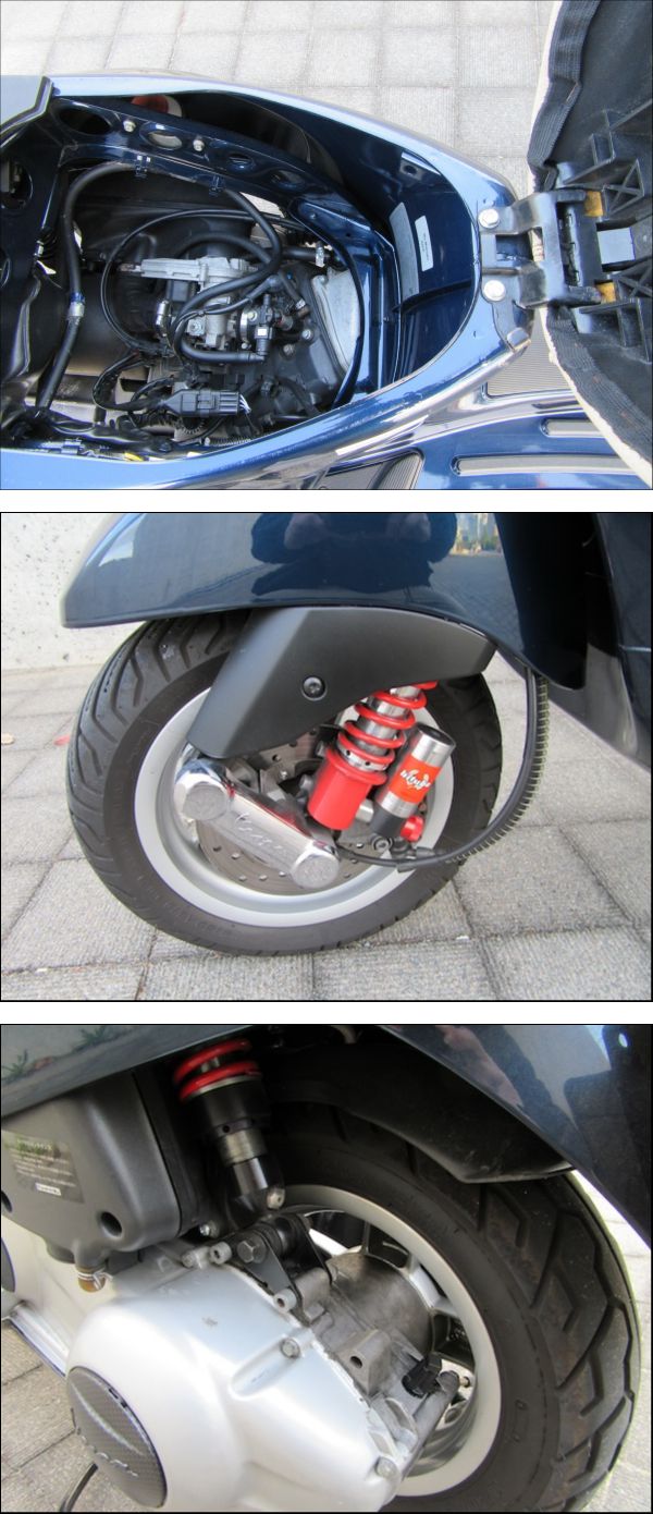 | ご覧いただきありがとうございます。 【車両情報】 車種:ベスパLX150ie 2v(インジェクション) 年式:不明 2009〜2011年の間になると思います。2V(2バルプ)です。 現車はフェンダーのクレストなどはなくオリジナルとは少し違います。 走行距離:10415km (少し距離が伸びます。) 排気量:150cc カラー:ミッドナイトブルー その他:前後、ビチューボのサス付き!! フロントのサスは塗装のハゲがあります。 スクリーン・ボックス付き 【状態の説明】 鉄製のボディは純正色のミッドナイトブルーで業者にて板金(前の左側)及びオールペンをしています。フロントフェンダーも業者にて塗装。 車体底面の塗装で凸凹がありますが全体的にツヤがあり比較的綺麗な車体です。 ヘコミはありません。 一部の部品はDIYにてガンで2液ウレタン塗装をしています。(プラスチックの部分やボックスの補修塗装に難あり) フロントホイール:塗装のバゲあり リアキャリア:錆あり プラスチックのメッキ部分:錆あり バックミラー: 左傷あり 錆あり ヘッドライトカバー: ネジ部分補修 内側なので見えません。この他に小さなカケあり ボックス: 使えますがフックをかける部分の固定に亀裂があります。 マフラー: サビ・ヤケ・塗装のハゲあり リヤブレーキ: 時々「鳴き」あり 【整備について】 3500km位で塗装する際に全バラにして整備しています。 LXでよくあるステアリングベアリングのグリス切れによるガタ等の異常はありません。 リコールが出た燃料ポンプは対策品になっています。 LXであるあるの経年劣化によるシートのヒンジの破損はありません。(サビはあります。) 6000km位でベルトを交換しています。 クラッチは6000km位で交換してありますLXあるあるのジャダーはありません。 時計はボタン電池式の単体のもので狂うことがあります。 エアクリーナー: 8400km で交換 ギヤオイル: 8000kmで交換 フィラーキャップからのオイルの滲みあり フロントブレーキ: フルード及びパッド 8200kmで交換 ブレーキホースも中古ですが程度の良いものに交換してあります。 エンジンオイル: 約3000kmごとに交換 前回9500km(フィルター交換×)で交換 タイヤ: 前8部山 後7部山はあると思います。(主観です) 灯火類: 異常なし キー: 2本あり この他にボックス用キー1本 車載工具: なし バッテリー: 今年9月に新品に交換 見えませんがハンドルも2液ウレタンで塗装しています。 ステアリングステムから続いているフォークの部分も2液ウレタンで塗装しています。 エンジンハンガーも2液ウレタンで塗装しています。小さなキズ・サビあり | |||