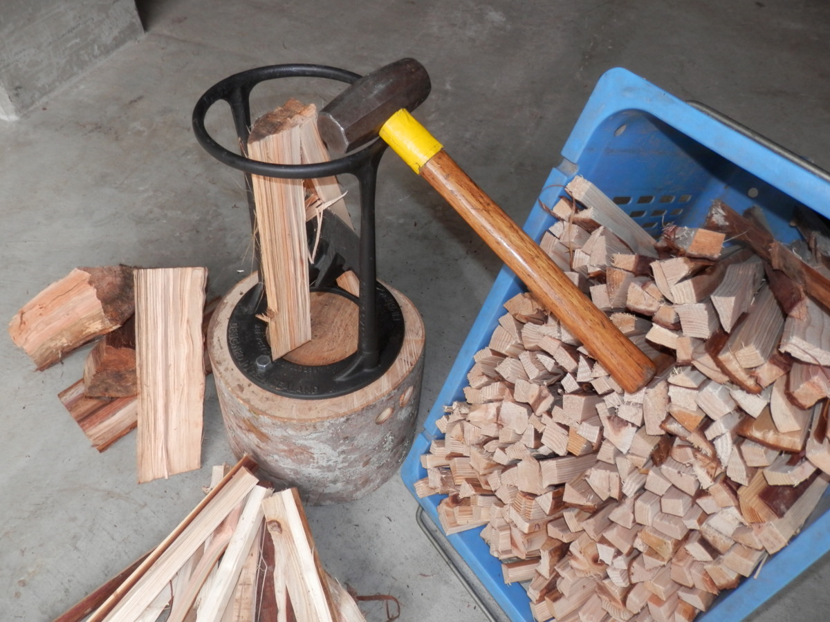 細く割って着火支援材として、自然乾燥にで良く乾燥させておりますので、古新聞等を敷き