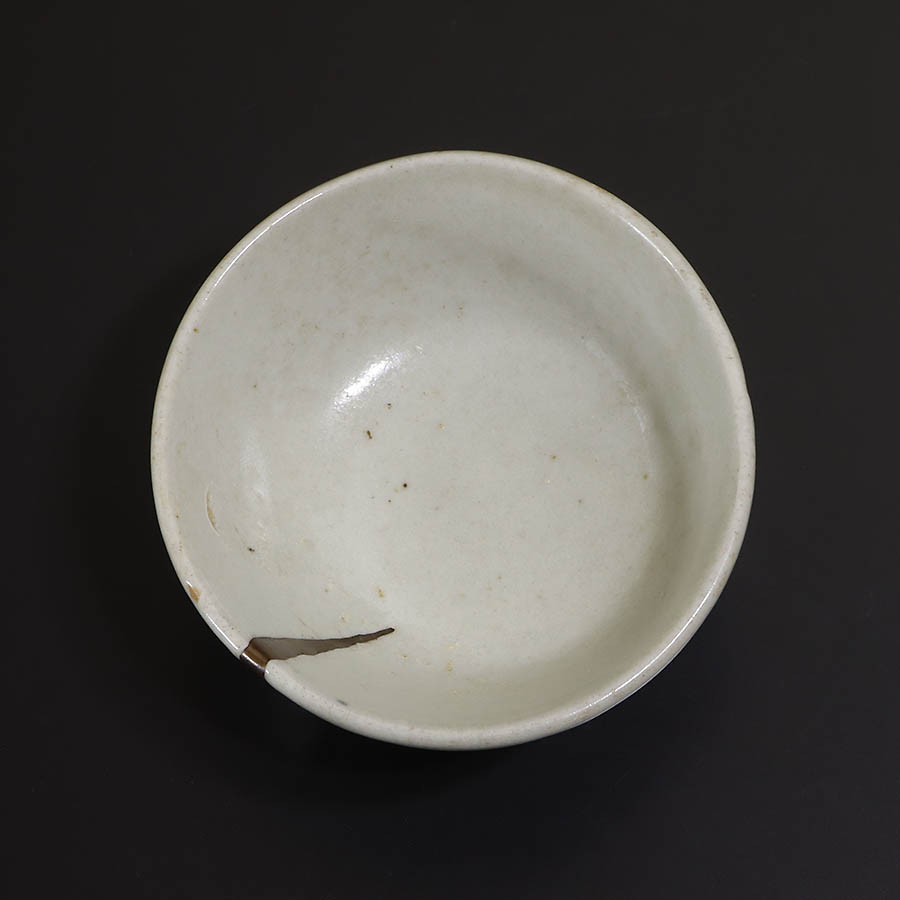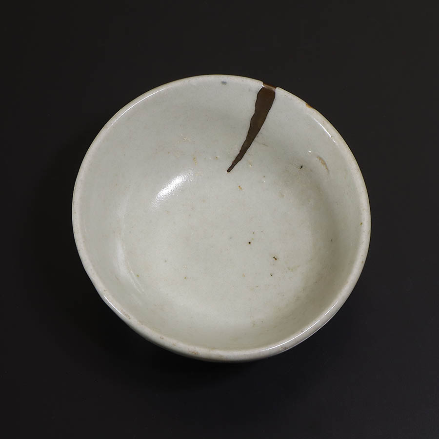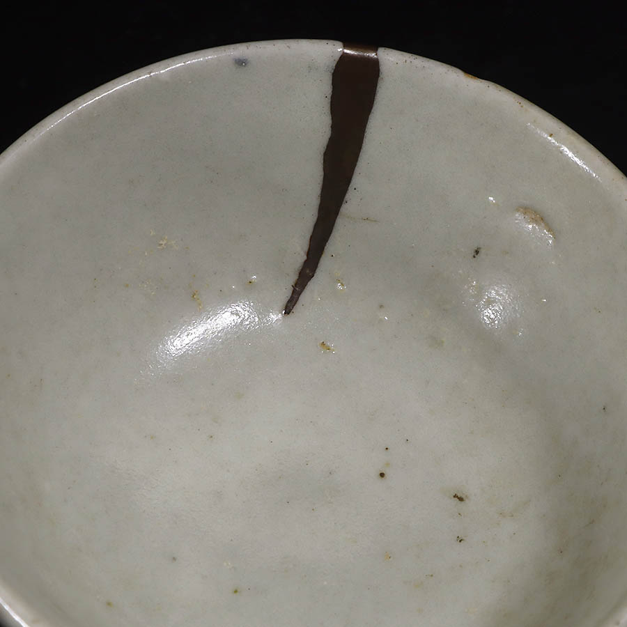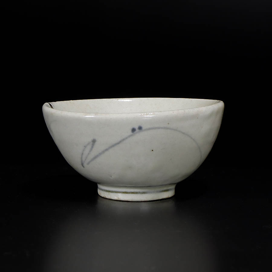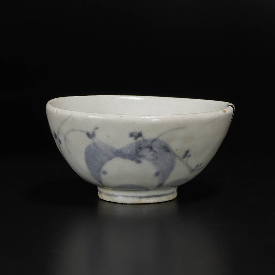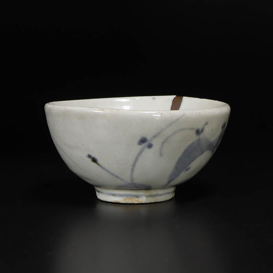 くらわんかの染付碗。波佐見窯の産。画像でお分かりのように口縁の窯キズに銀直しが施されています(興味深いことに当時はこのままで出荷されていたようです)。波佐見窯の産。径9.9cm、高さ5.1cm。湯呑として、やや大ぶりですがぐい呑としてお楽しみいただければ幸いです。