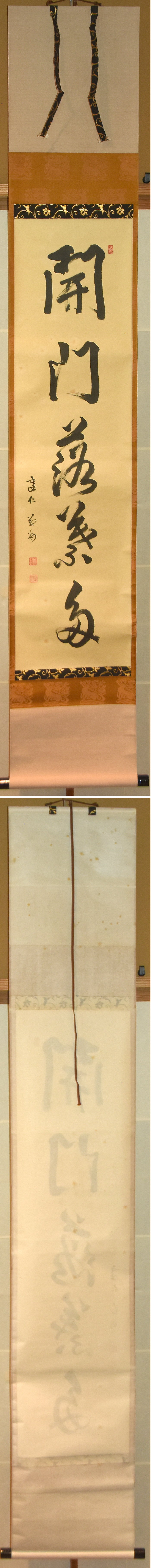 【真作】建仁寺派管長 竹田益州「開門落葉多」一行書 紙本 肉筆 掛軸です。 「開門落葉多」は、「門を開けば落ち葉がたくさんあった」という情景を表す『大燈国師語録』に出てくる禅語・茶道でよく使われる言葉です。 夜通し降り続いた雨音だと思っていたものが、実は軒先を打つ落葉の音だったという幽寂で季節の移ろいや「諸行無常」の理を感じさせる句です。 茶席では「すべてを捨て去った爽快な境地」や「自身の目で確かめることの大切さ」など深い意味合いで掛け軸などに用いられます。 本作は紙本です。 シワは比較的少ないですが本紙に数カ所丸いシミが見受けられます。 ※予めご了承の上ご入札お待ちしております。 ※撮影の際に生じた写り込みなどがございます。 ご理解の程よろしくお願い致します。 |
