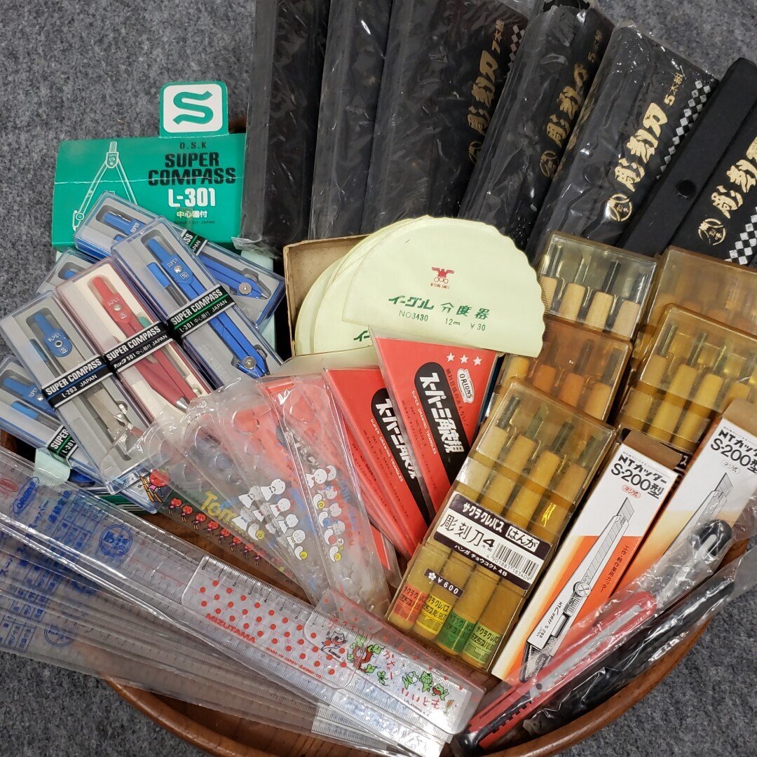 昭和の懐かし文房具まとめてあります。 | 定規 15本 三角定規 10個 分度器 43個 カッター5本 さくら彫刻刀 5本セット 2個 4本セット 3個 ギンポー彫刻刀 5本セット 3個 7本セット 3個 発送サイズ |