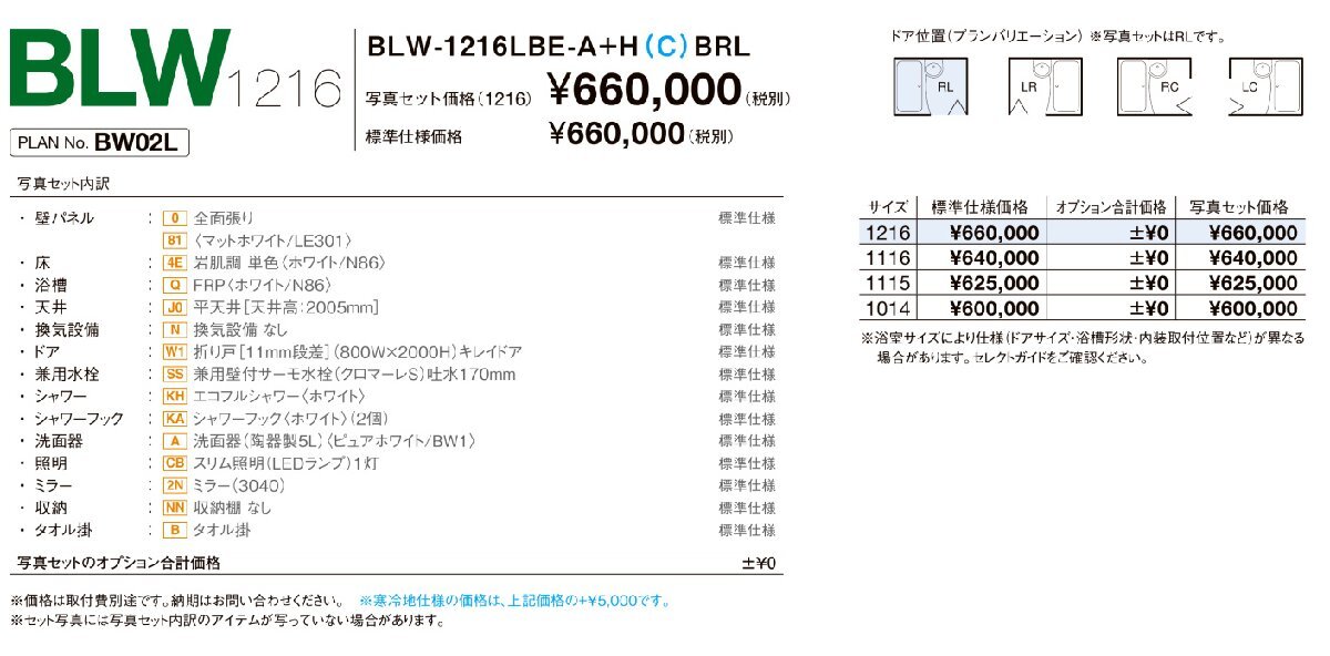 | ◎LIXIL集合住宅用洗面付ユニットバス[1216サイズ] BLW-1216LBE+H 即決価格は、写真セット価格660.000円のなんと 71%OFFで 210.540円【消費税込】 ◆据付必要寸法1310×1680×2494mm。 ◆浴槽と洗い場床が分割構造、ラクに搬入・ラクに施工。 ◆低床設置で、浴室への出入りがしやすい、浴室入口段差11mm。 ◆浴槽への出入りがしやすい、またぎ高さは約450mm。 ◆翌朝にはサラリと快適、イージードライフロア。 ◆照明は、スリム照明(LEDランプ)です。 ◆スッキリデザインで汚れにくく、お掃除しやすい『キレイドア』折り戸。 ◆ドア位置は4通り(RL・RC・LR・LC)から選択できます。 ◆天井換気扇は付いていません。 | |