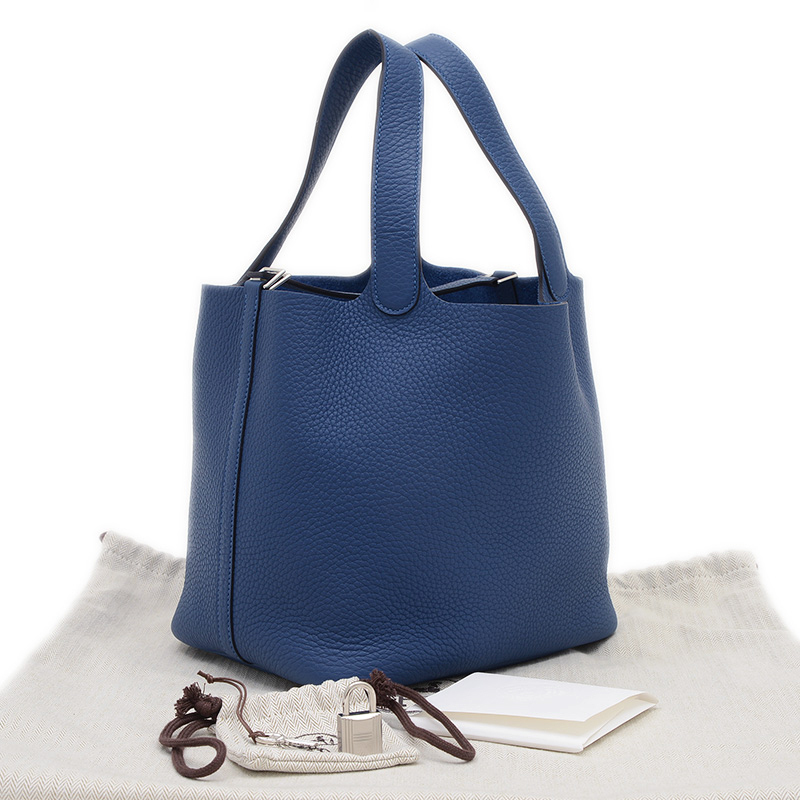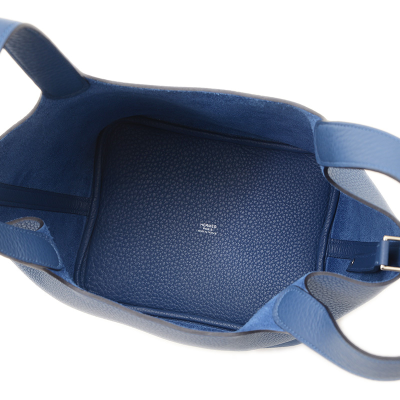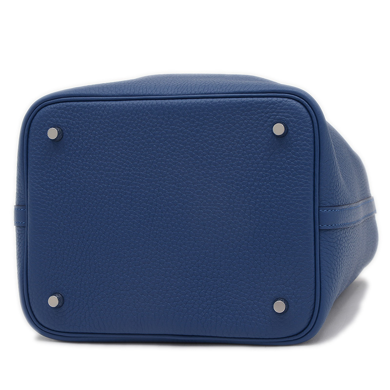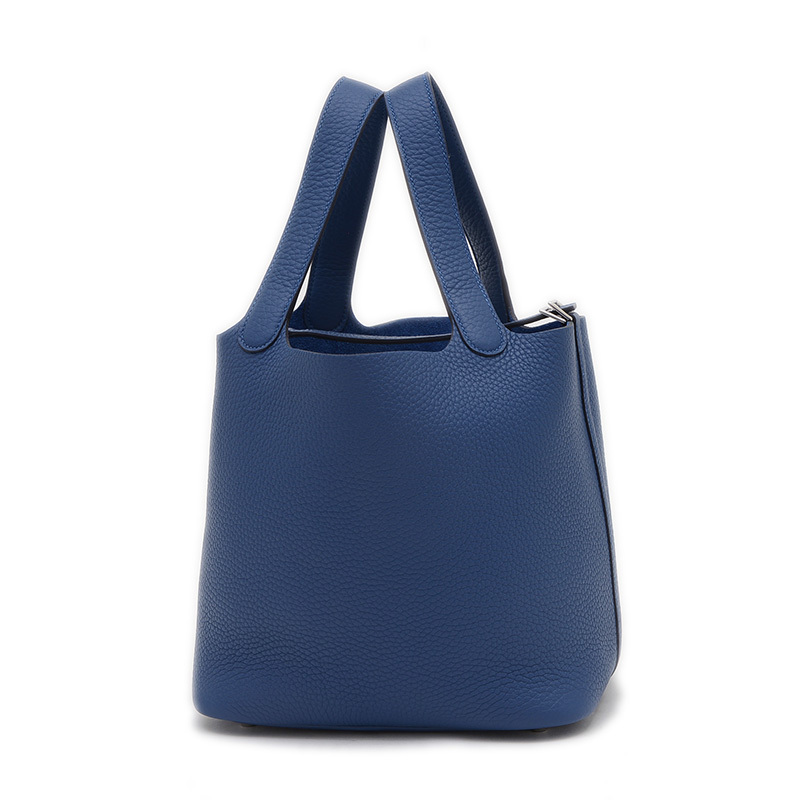 | 商品特徴 | しなやかで人気の高いトリヨンクレマンス素材を使用した、深みのある美しいブルータイ(青みがかったグレー)カラーが特徴のハンドバッグです。シンプルなバケツ型フォルムと、開口部を南京錠でロックするユニークなデザインが魅力。MMサイズは日常使いに最適な収納力で、クールなシルバー金具が洗練されたアクセントとなり、持つだけで装いに上品さを添える逸品です。 |