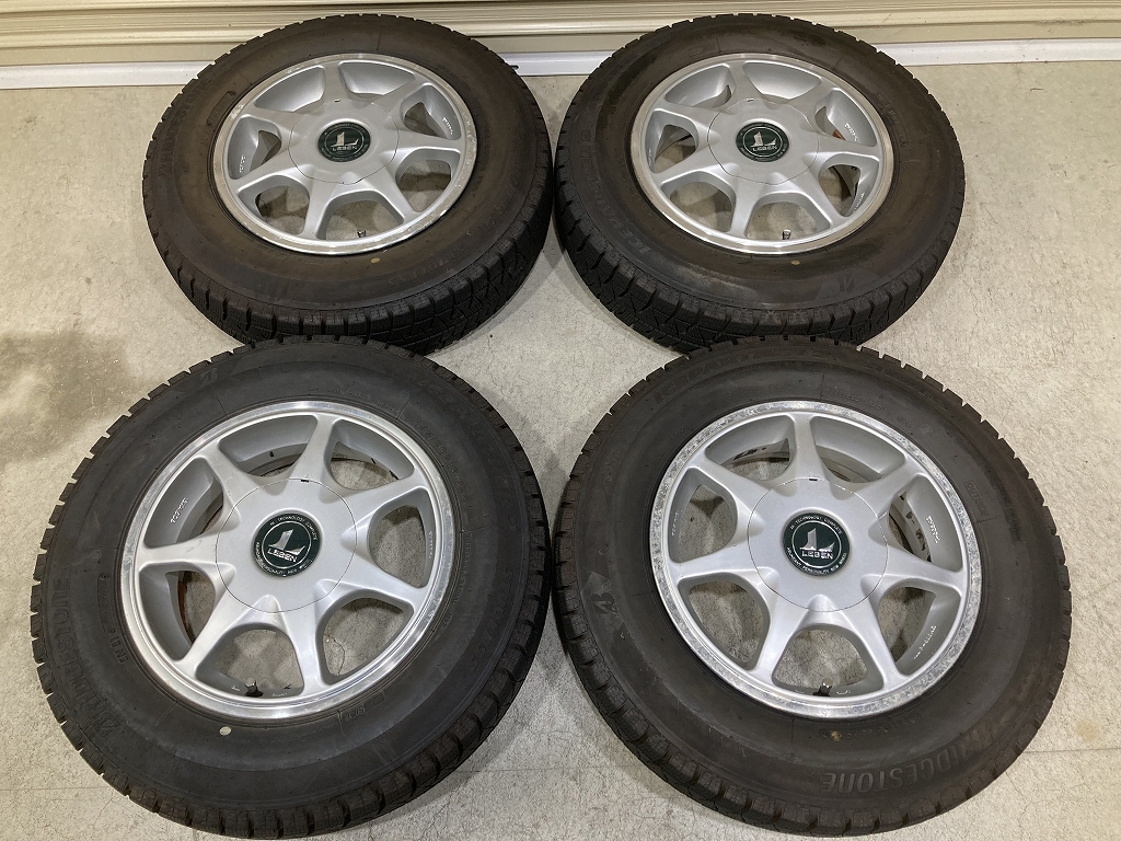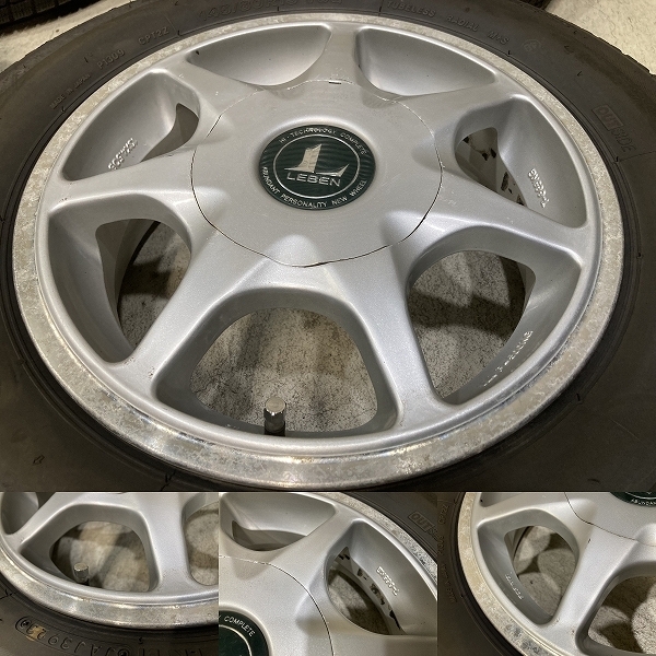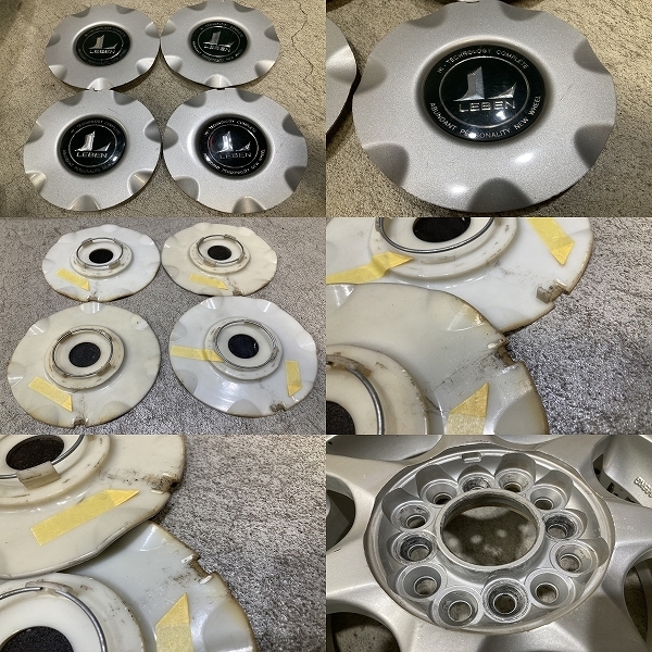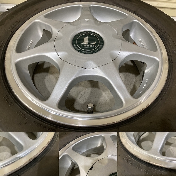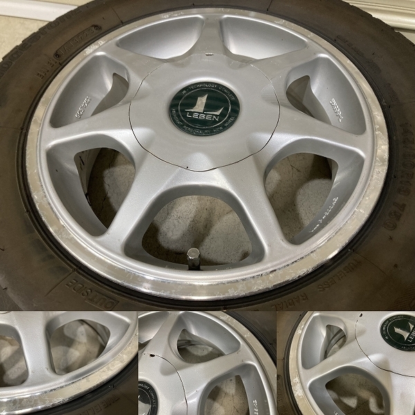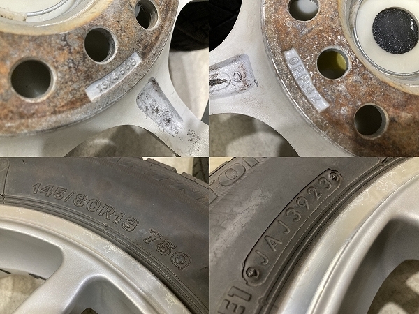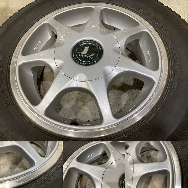 〇ホイール情報 LEBEN ・リム径 13インチ ・リム幅 4.50B ・オフセット +42 ・PCD 100/110/114.3 マルチ ・穴数 4H ・ハブ径 約73mm(実測値のため誤差が生じる場合がございます。) ・状態 小傷、擦り傷、汚れ、腐食等ありますが、まだまだ使用可能な状態です。 センターキャップ裏の爪が複数箇所破損していますので画像にてご確認ください。 〇タイヤ情報 BRIDGESTONE ICEPARTNER2 ・サイズ 145/80R13 ・製造年 2023年 ・本数 計4本 ・残溝 約8-9分溝(センター付近測定時) ・状態 エア漏れ、パンク修理痕、ビード切れはありません。 | ||||