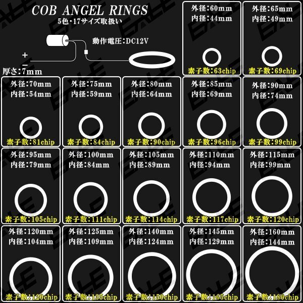 COB-LED カバー付き エンジェルリング SMDリングのようなツブツブ感がなく、ナイトシーンに美しい光の輪をつくり出します。 また、外部抵抗を用いる事により、、基板上での通電不良によるトラブルを軽減。 インストール性に優れたコンパクトタイプの脱着コネクタを採用しています。 発光カラー全5色に17サイズ取扱い! ※出品は記載のカラー、サイズです。 他のカラーやサイズは⇒ こちら 数量1で1個の出品です。防水ではございません。 |