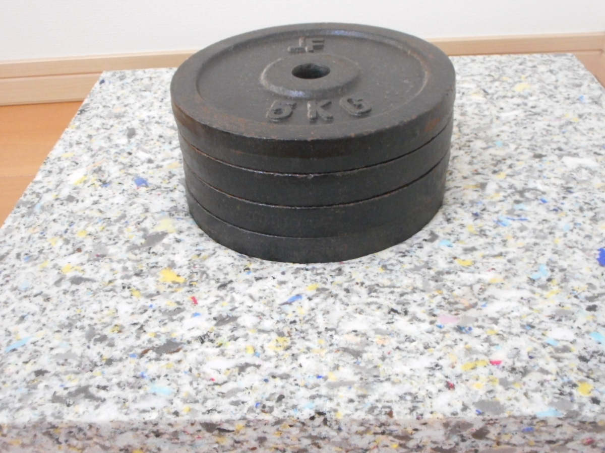![]() | 通常のウレタンの比重のかたさ約16 ダンベル(おもり)1個5Kg×4個約20Kg 下のダンベル(おもり)1個目のウレタンが 沈んでいます。 | |