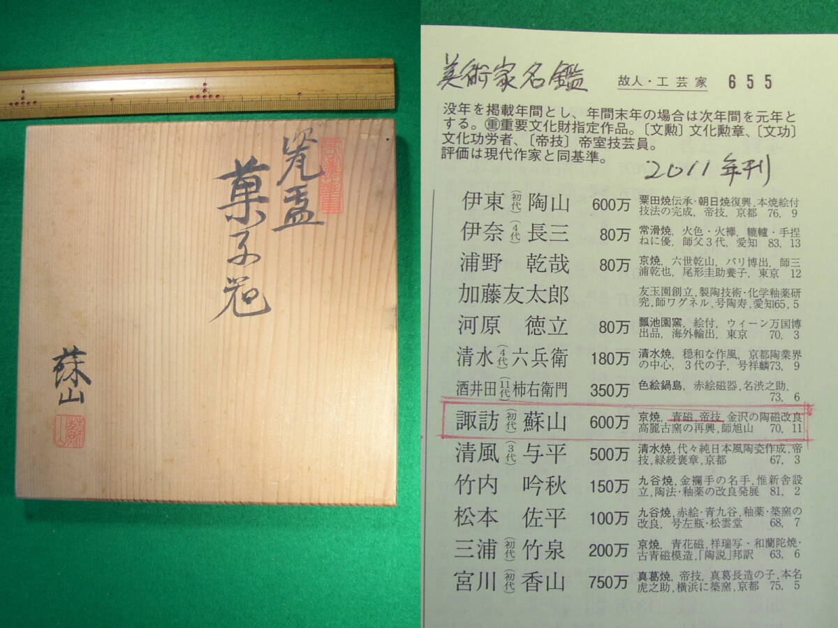 明治時代の「初代・諏訪蘇山」の在銘で「帝室技芸員」の朱印のある「共箱」入りで「大徳寺僧堂師家」の「松岡寛慶」の「墨書」ある「菓子器」ですから 当然の事として若干「使用感・経念感」はありますが