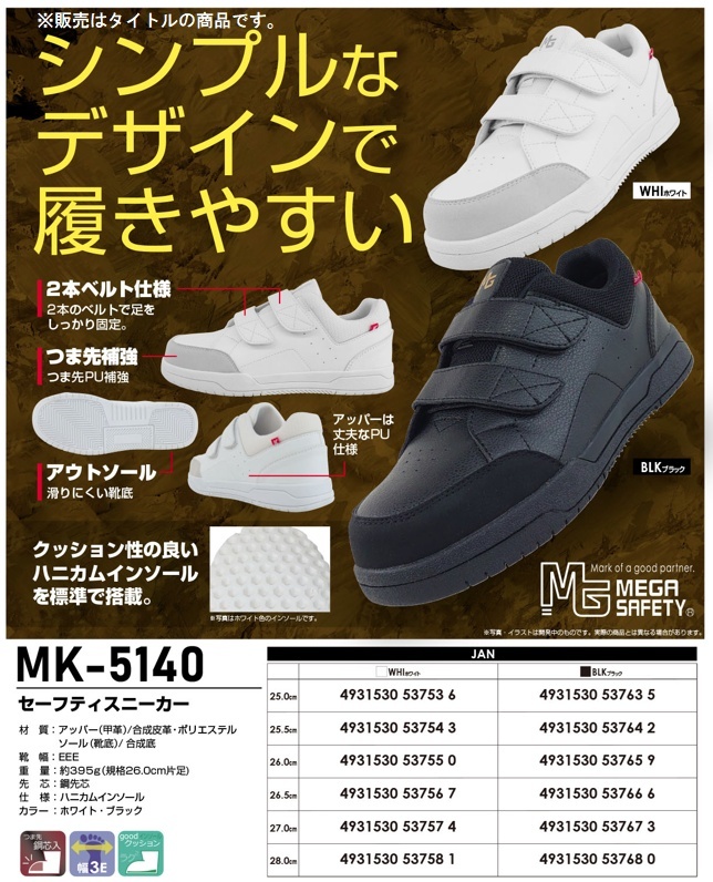 喜多 KITAシンプルなデザインで履きやすいセーフティースニーカーMK5140 MEGA SAFETYカラー:ホワイト※販売はタイトルの商品です。■特長・シンプルなデザインなので老若男女を問わず履いていただけます。・適度な弾力のハニカム構造のインソールが衝撃を軽減。・2本ベルト仕様でしっかり足を固定できます。■素材・アッパー(甲革):合成皮革/ポリエステル・ソール(靴底):合成底・靴幅:EEE・先芯:鋼先芯・仕様:ハニカムインソール