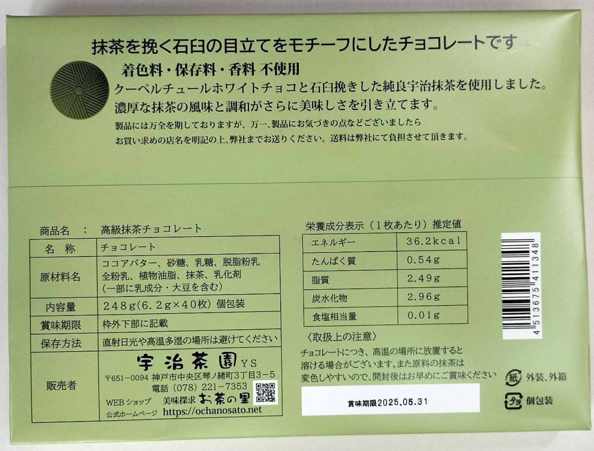 ココアバター・砂糖・乳糖・脱脂粉乳 全粉乳・植物油脂(大豆由来)・抹茶 乳化剤 (大豆由来)