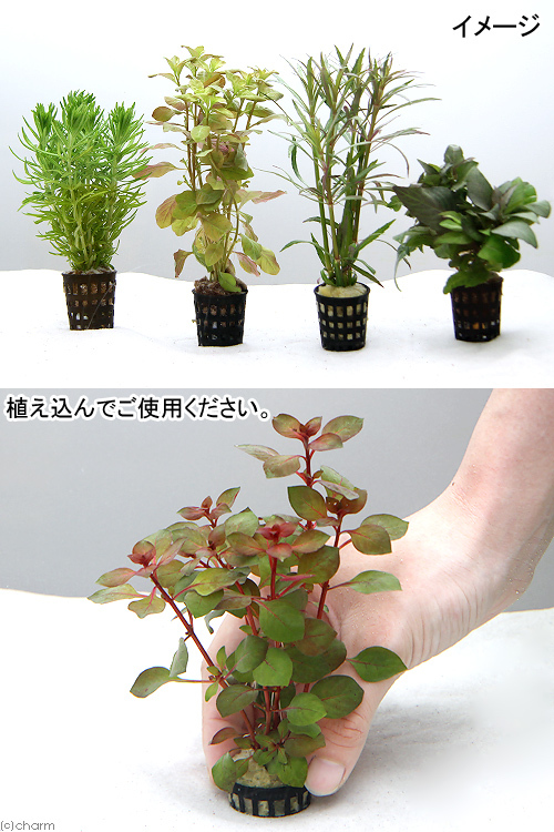 ※画像はイメージです、商品画像の現物出品ではございませんので予めご了承ください。※掲載写真は15ポット分を用いたセットイメージです。季節によりサイズや葉数、色、量等が画像と異なる場合がございます。※ポット、水草は低床に植え込み栽培して下さい。浮力がある為そのままでは浮き上がってしまう場合があります。※植物の種類はおまかせとなっております。形状や色彩は選べません。※枯れや葉の痛みなどが入る場合がございます。ご了承の上お買い求めください。発送サイズ10cm前後(ポット含む)※1ポット当たり2~10本植えです。水草の種類により1ポット当たりの本数は異なります特徴育成難易度 → ★★☆☆☆1つのポットに1種類の水草を植え込んでいます。低床にポットごと植え込むことで簡単にボリューム良くレイアウトすることが出来ます。水中化するまでは複数回のトリミングが必要となります。水草の先端が水面に届くようであれば、先端部より15cmほどでカットし、差し戻しを行うことで増やすことが出来ます。残留農薬状態無農薬