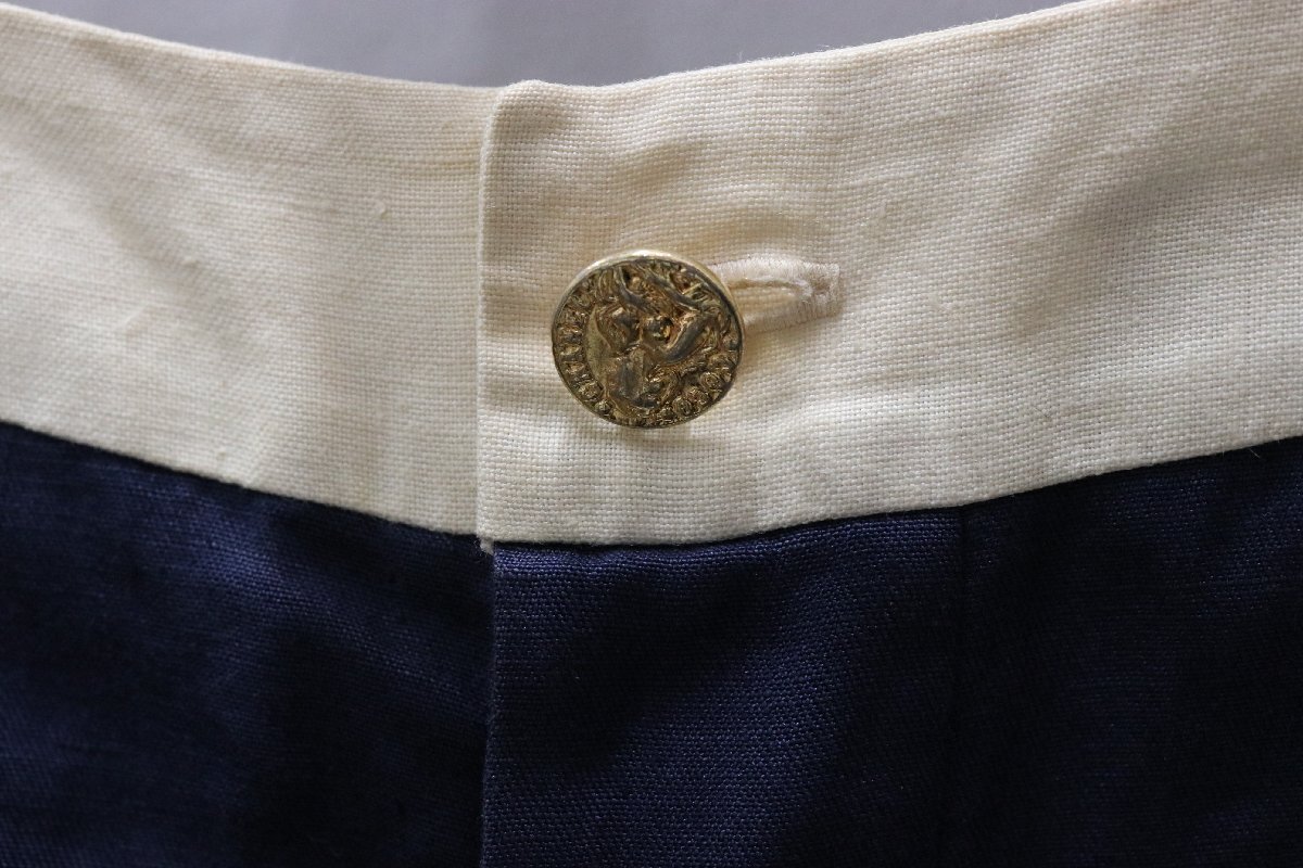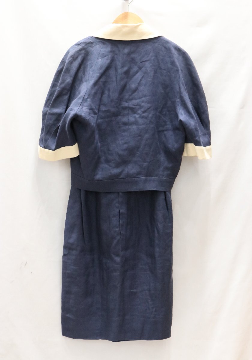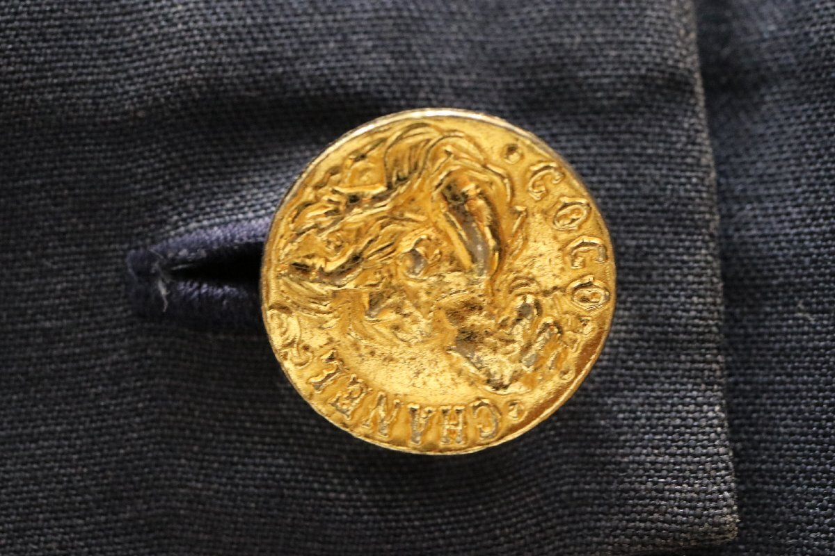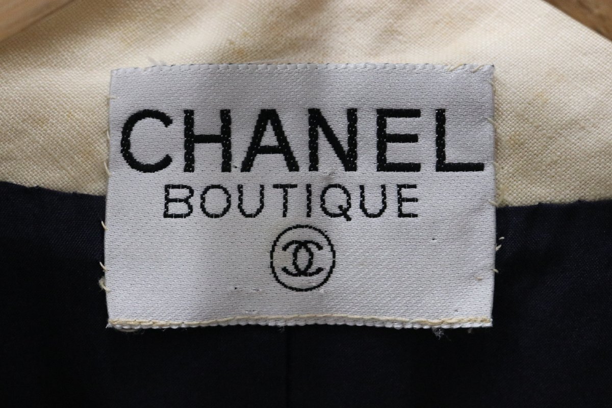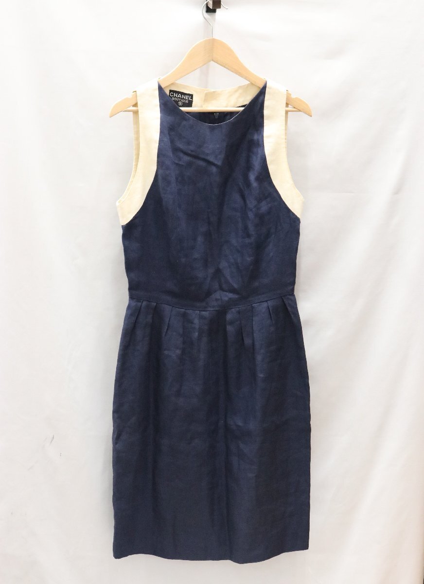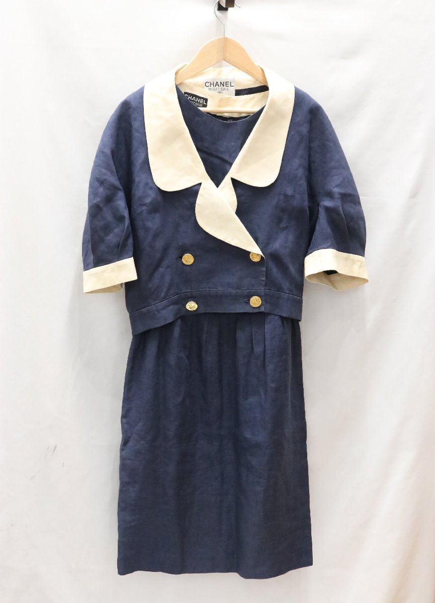 | CHANEL シャネル リネンダブルジャケット ノースリーブワンピース セットアップ 金ボタン ネイビー×ホワイト タグカット | ||