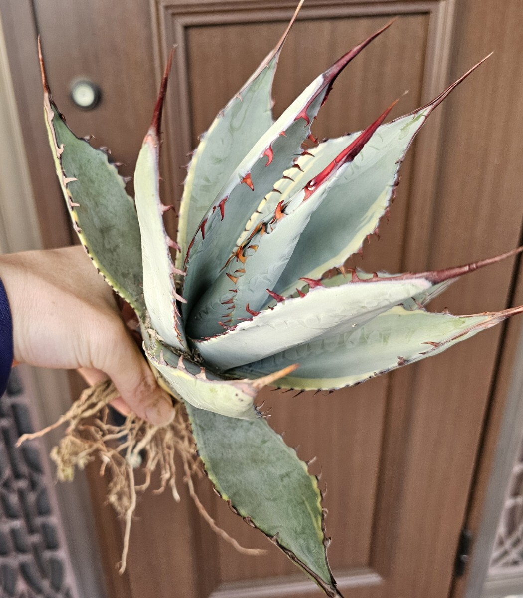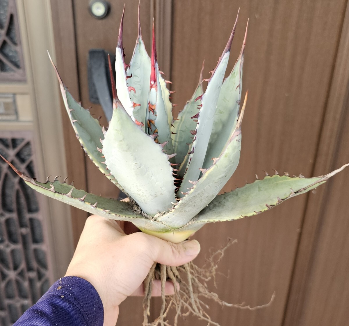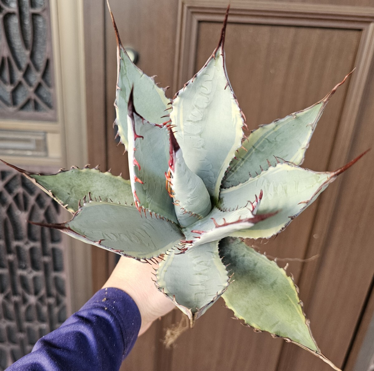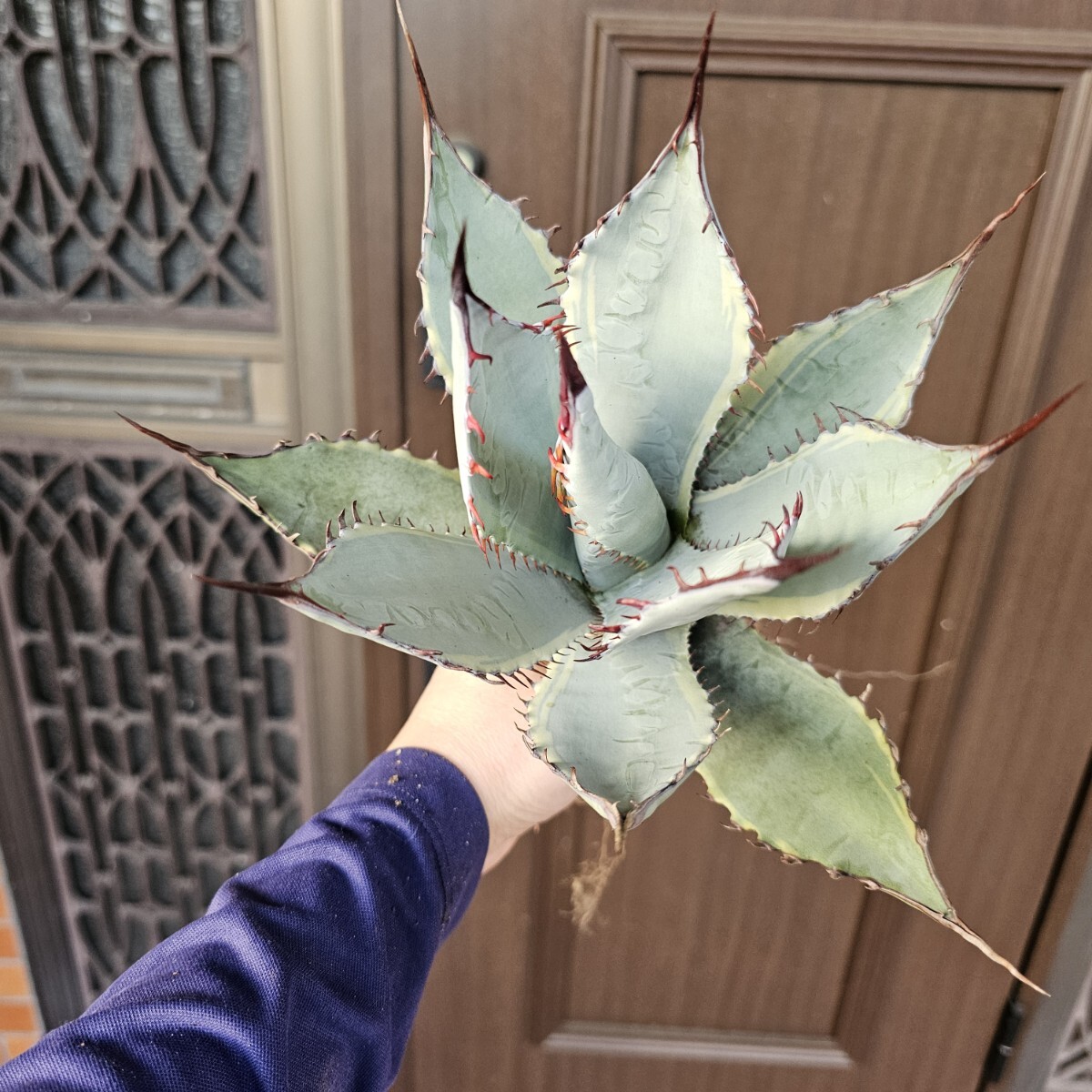 舞扇斑入りです。サンスポットに似ていますが違います。青さ、斑入りと刺で魅力が増しています。屋外管理品につき、多少葉の汚れがあります。直径23㎝。| 出价者 | 信用 | 价格 | 时间 |