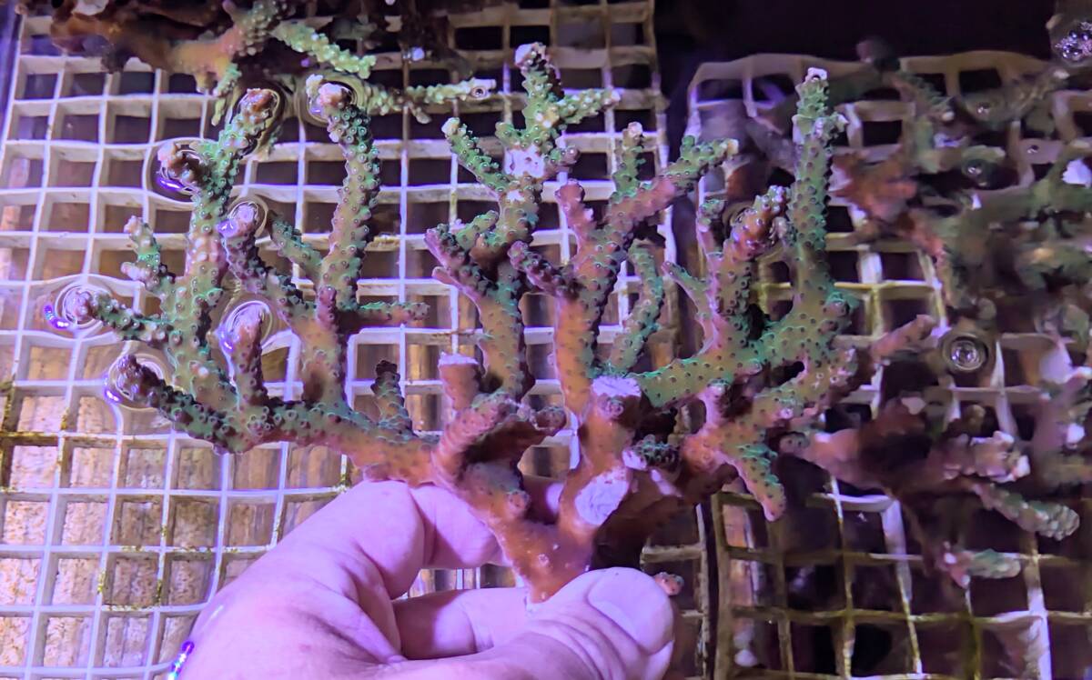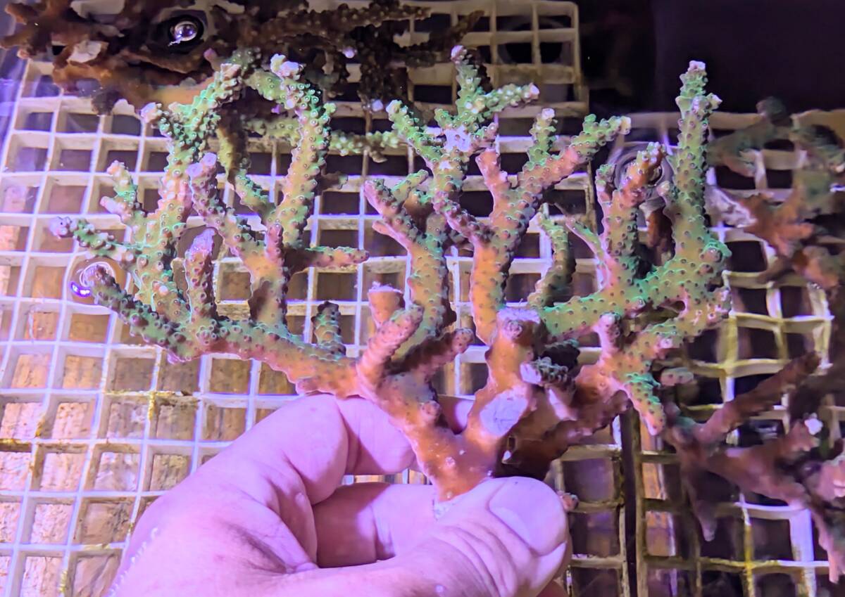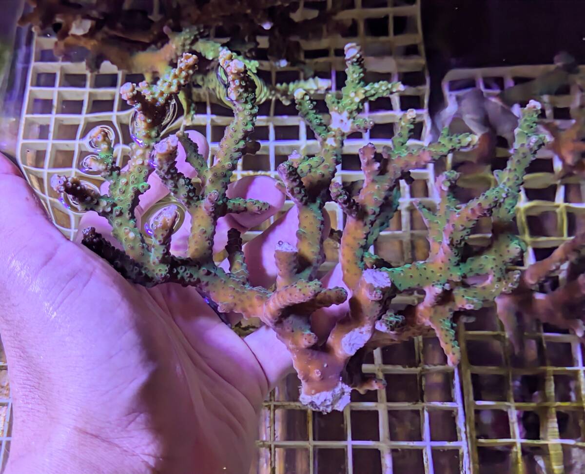 こちらのオークションで購入して当方の水槽内で増殖したサンゴです。購入時の名称は忘れてしまいましたがインドネシア産で手の平サイズをパディングした個体です。画像撮影時に15cm前後になります。(目測の為、若干の+-はご容赦下さい。LED照明下で青,白,赤系の切替をした上で撮影してあります。)画像の個体をお送り致します。2日以上かかる地域の方はリスクはご承知おき下さい。(沖縄、九州、北海道及び離島)到着御希望日(仕事の都合上、発送が出来ない日にちもございますのでご了承の上2〜3日の予備日にちをお知らせ頂けましたら幸いです。お時間、センター止もございましたら併せましてお知らせ下さい。)運賃は本州2000円,その他地域は2500円のご負担をお願い致します。(複数落札を頂いた場合は330円の差額が発生致しますのでご了承下さい。)原則、死着保障はありません。生体ですのでご理解、ご了承の上ご入札をお願い致します。写真での判断となるため、ノークレーム・ノーリターンでお願い致します。ネットでの取引になりますので上記の内容に関しまして御理解ください。飼育環境や照明機器,個体によっては、色味、柄など生体の体調や環境の変化、成長に伴う変化などがある場合もある事をご承知ください。神経質な方,細部に渡りこだわりの有る方の入札はご遠慮頂きます様お願い致します。ご不明な点や詳細に関しましては必ずご質問からお問い合わせをお願い致します。梱包中のスレや傷、輸送中の事故などの責任は負いかねますので、ご了承の上、入札お願い致します。落札後、ナビにて24時間以内の御連絡,3日以内のご入金,1週間以内の発送及び到着日当日中のお受け取り連絡をお願い致します。商品の発送は、入金確認後3日以内に行いますが生体の体調により、出品キャンセル、発送の遅れや、最悪お届けできない場合があります。生体の状態によっては、オークション中に出品をキャンセルする場合があります。悪い評価が多い方の入札はお断り致します。落札後や入札中に取り消します。以上の条件をご理解頂けます方のご入札をお願い致します。