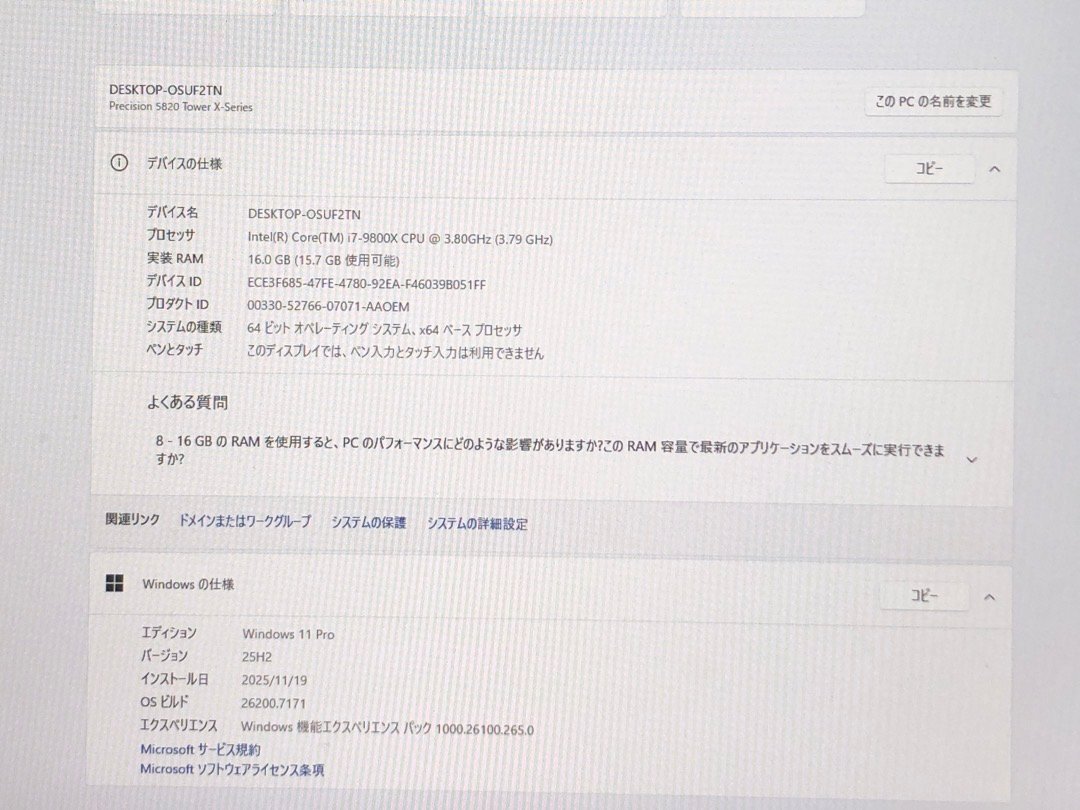 | CPU | Intel(R) Core(TM) i7-9800X CPU @ 3.80GHz | 光学式ドライブ | なし |