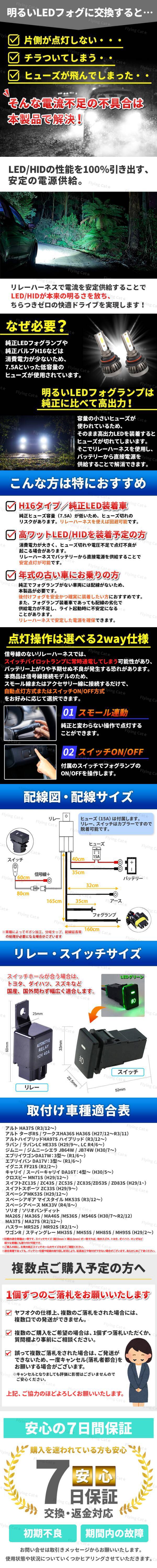 | 【セット内容(本体1台分)】 ・LED ON/OFF フォグスイッチ×1個( LED発光色 ) ・配線コード×2個 ※本製品には、フォグランプ本体・車両への固定ステーは付属されておりません。 ※説明書は付属しませんので専門業者、整備知識がある方に推奨します。(配線図は画像よりご確認ください) 【商品サイズ】 ※画像をご確認ください。 【仕様】 ・12VDC リレー付 ・カプラー形状:H8 / H11 / H16 ・LEDスイッチ (縦33mm×横22.5mm) |