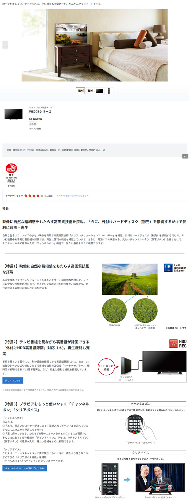 ソニー 32V型液晶テレビ ブラビア KJ-32W500E を出品いたします。 ■特徴■ 地デジをキレイに、すぐ見られる。 使い勝手も充実させた、 かんたんプライベートモデル 映像に自然な精細感をもたらす高画質技術を搭載。 さらに、外付けハードディスク(別売)を 接続するだけで便利に録画・再生 自然な色合いで、ノイズの少ない映像を再現する 高画質技術「クリアレゾリューションエンハンサー」を搭載。 外付けハードディスク(別売)を接続するだけで、 テレビ視聴中も手軽に裏番組が録画でき、 再生に便利な機能も搭載しています。 さらに、電源オフの状態から、 見たいチャンネルボタン(数字ボタン)を押すだけで、 そのチャンネルで電源が入る「チャンネルポン」機能で、 見たい番組をすぐに視聴できます。 映像に自然な精細感をもたらす高画質技術を搭載 高画質技術「クリアレゾリューションエンハンサー」は 自然な色合いで、 ノイズの少ない映像を再現します。 地上デジタル放送などの映像を、 精細かつ、奥行きのある表現でお楽しみいただけます。 テレビ番組を見ながら裏番組が録画できる 「外付けHDD裏番組録画」対応(*)。 再生機能も充実 番組を見ている最中にも、 別の番組を録画できる裏番組録画に対応。 また、CM前後やシーンの切り替わりなどで 番組を自動で区切る「オートチャプター」、 短時間で視聴できる「1.3倍早見再生」など、 再生に便利な機能も搭載しています。 「チャンネルポン」 たとえば、 ◎「あっ、星占いのコーナーがはじまる! 電源入れてチャンネルを選んでいるうちにてんびん座を見逃しちゃう…」 ◎「家に帰ってきたら、かならずN局のニュースをチェックするのが習慣…」 そんな方におすすめの機能が「チャンネルポン」。 リモコンのチャンネルボタン(数字ボタン)で電源が入り、 見たい番組をすぐに視聴できます。 「クリアボイス」 たとえば、ニュースキャスターの声が聞きづらいときに、 声をより聞き取りやすくできる『クリアボイス機能』を搭載。 リモコンのボタン1つでかんたんにオン/オフできます。 ■仕様■