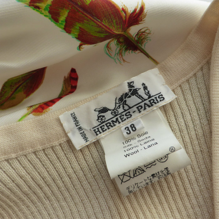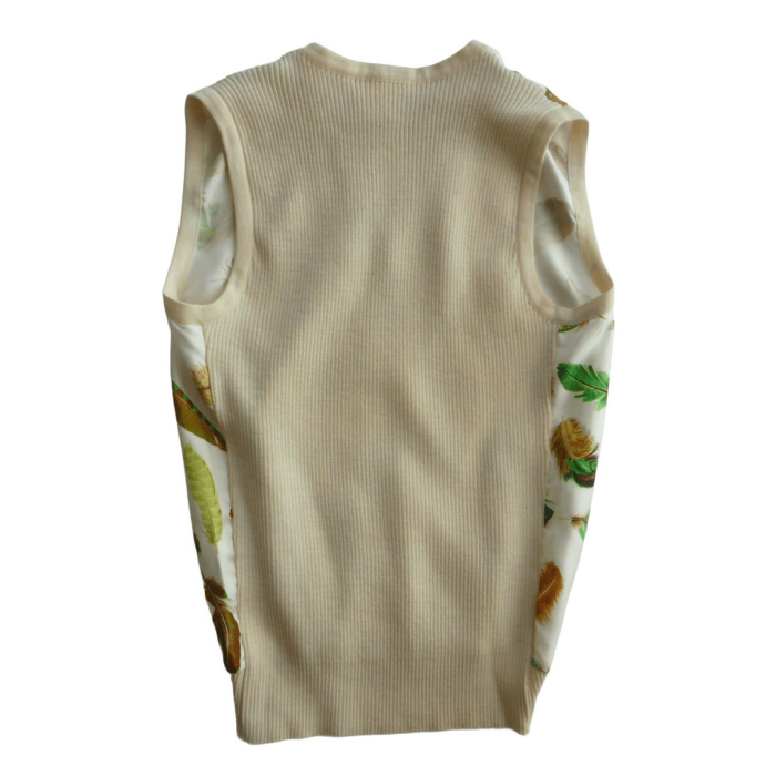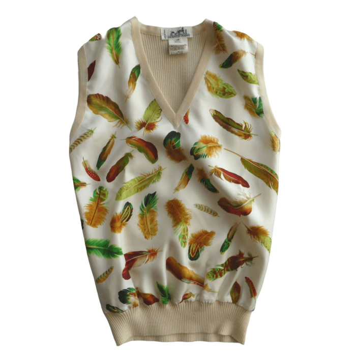 | エルメス(HERMES) シルク×ウール リブニット Vネック ベスト ヴィンテージ 38 羽柄×ベージュ ウェア(中古) |