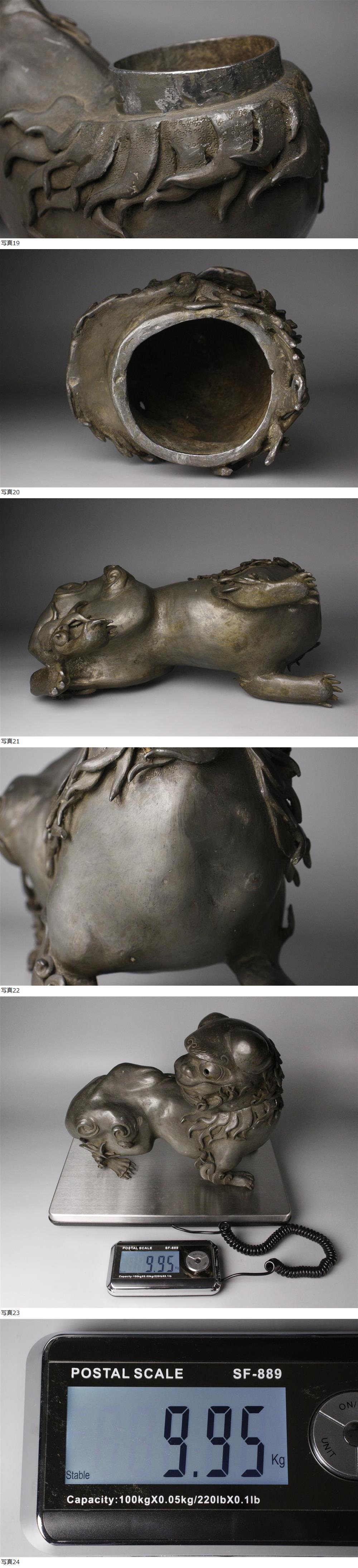 26020526* * * 商品詳細 * * * ここでしか出逢うことのできない唯一の美をご紹介させて頂きます。 動きのある躍動的な姿、細部まで繊細に造り込まれた古錫製香炉のご紹介です。 顔立ちは凛々しく迫力があり、鋭い牙に爪、立派なたてがみ等細部まで精巧に造り込まれています。 強靭な筋肉を感じさせる四肢の表現も素晴らしく、 経年を経た肌地がその姿に一層貫禄を持たせています。 重量は約10kg、手にするとずっしりとした確かな重みがあります。 造り手の素晴らしい技が光る逸品をこの機会に是非お求めください。 ■サイズ/横35cm×縦27.5cm×奥行14㎝ 重量9.95kg ■状態/スレ、キズ、ヘコミ、シミ、経年による傷みがございます。 ※写真にてご確認、ご了承の上ご入札下さい。 * * * 支払詳細 * * * !かんたん決済 * * * 発送詳細 * * * 入金確認後3営業日以内に発送致します。 ※直接引き取りも可能です。 60~160サイズにつきましては 佐川急便、ゆうパックのどちらかで発送いたします。 ゆうパック発送の場合、弊社の発送日から追跡サービスに問合せ番号が反映されるまで 約1日ほどお時間がかかりますのでご了承下さい。 * * * 注意事項 * * * 運送中の破損があった場合は速やかに当社までご連絡下さい。 保険を利用するのに受取連絡後に運送会社による現場での破損状況確認が必要となります。 勝手に返送されますと保険の適用外となりますのでご注意ください。 * * * * * * お問い合わせ:082-236-8669 |