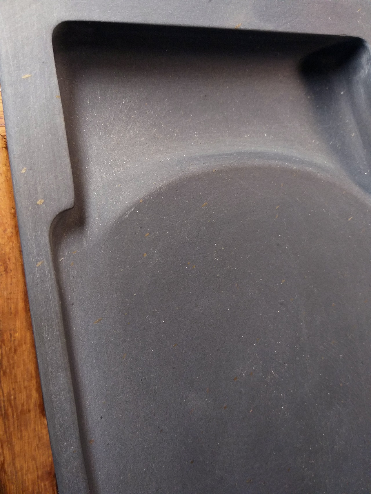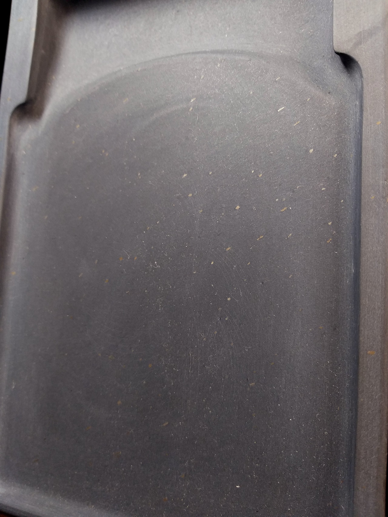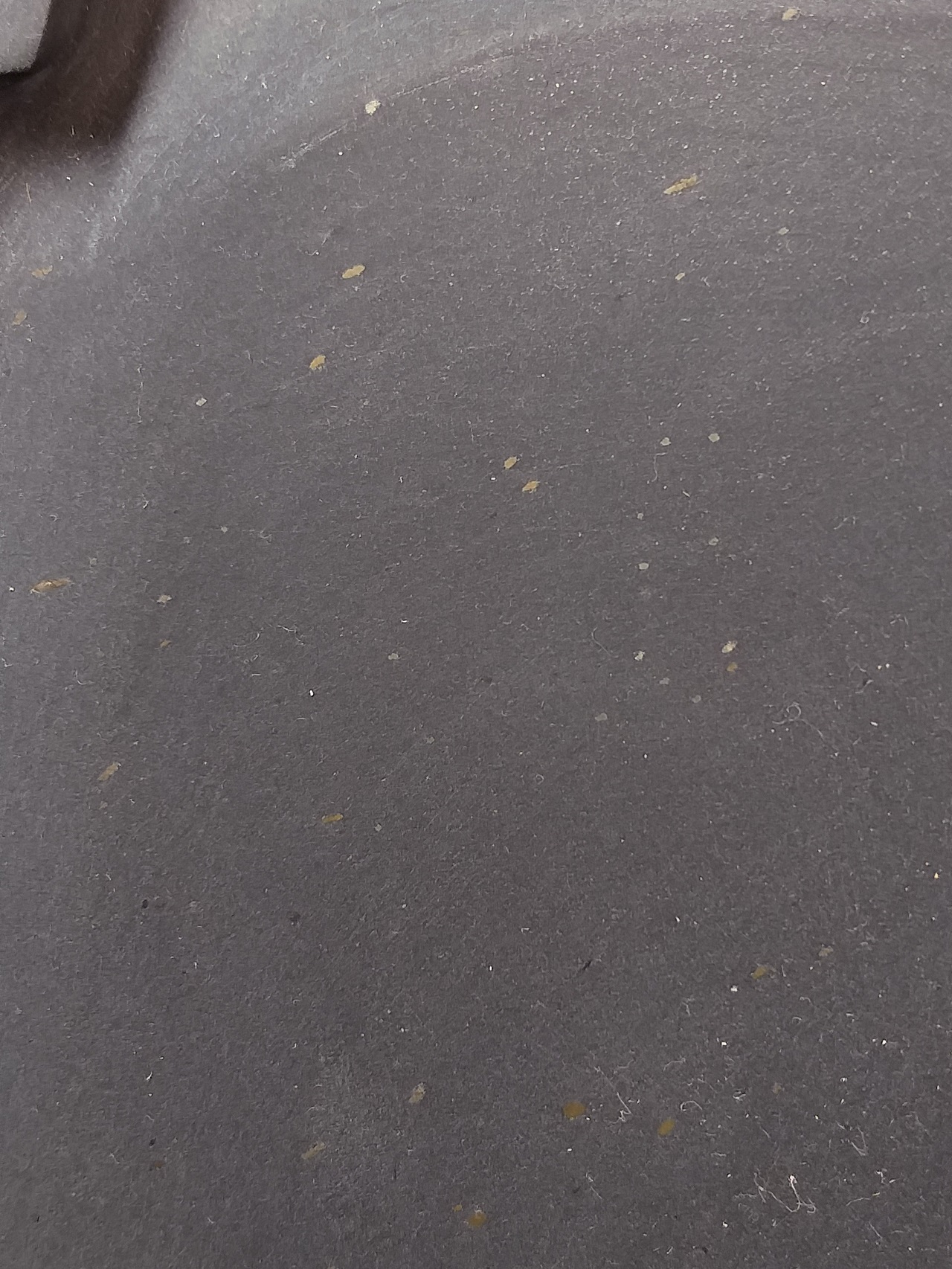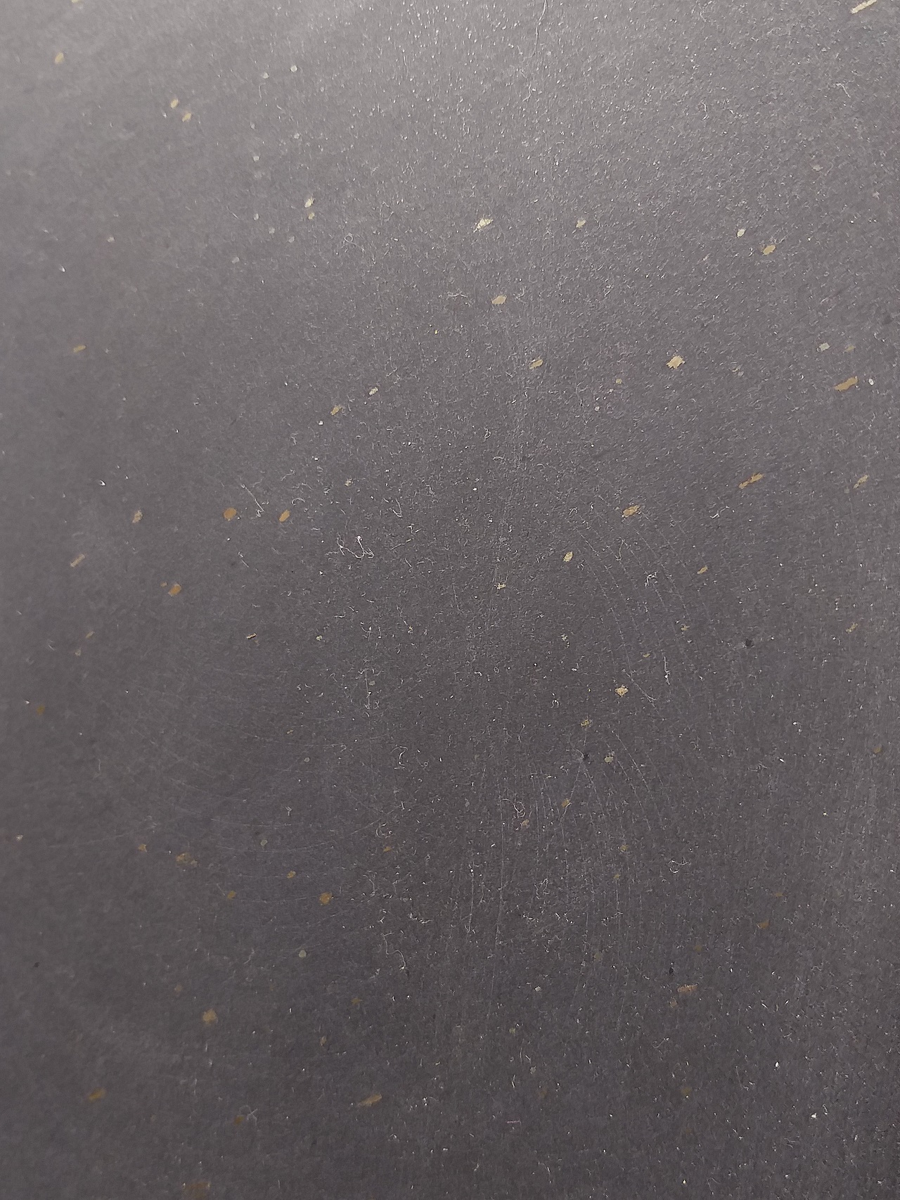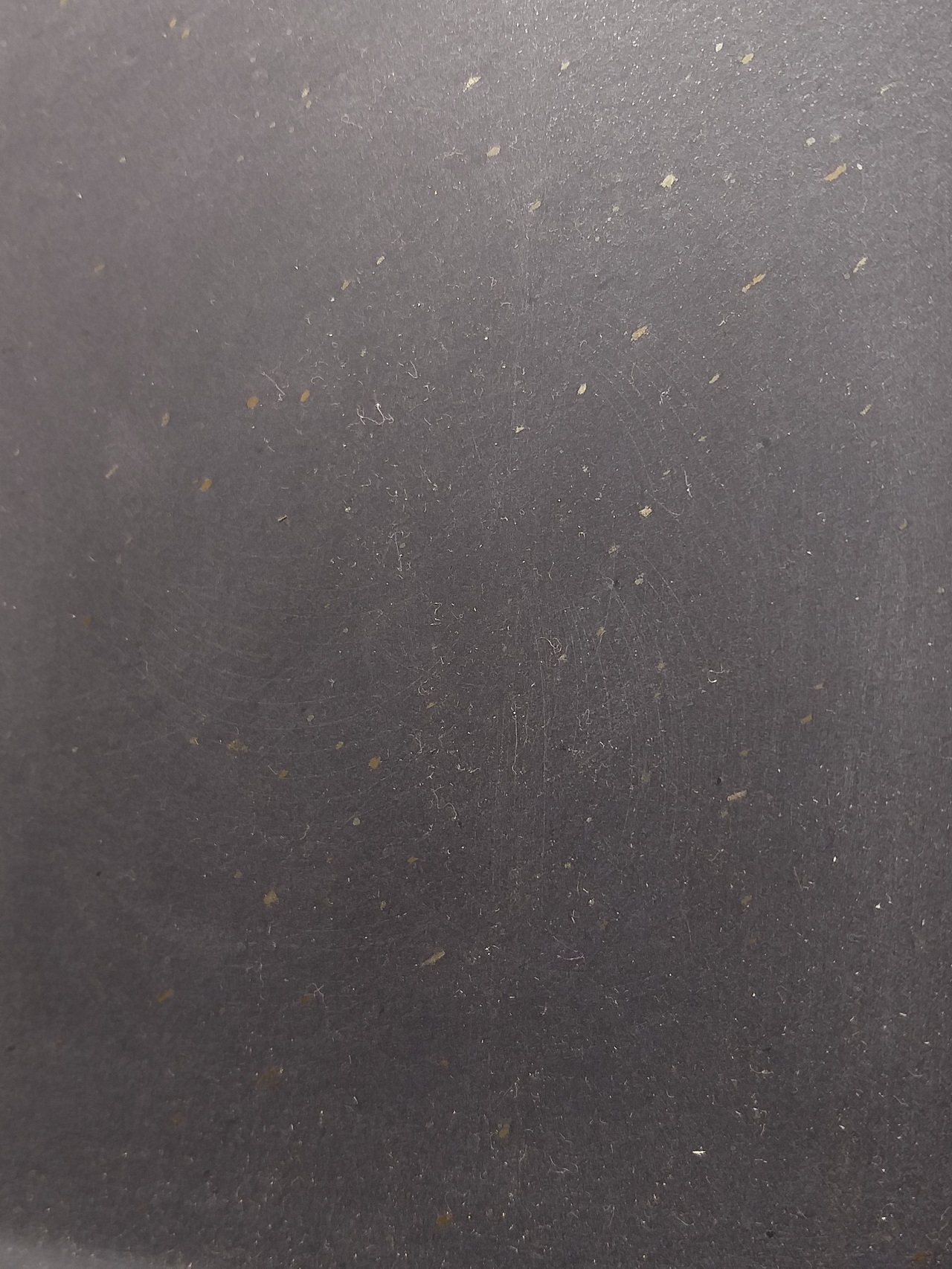 画像は、スマホで撮影しております。 撮影時、撮れた写真が非常にブレブレでした。 また、写真映りの色むらも非常に激しいです。写真映りが、灰、藍色味がかっております。実際品の色合いは、もっと濃く、深みがあるもっと綺麗で純正で綺麗な色をしています。硯板表面の色合いが均等でない原因は、撮影時に、手の平で拭いたときに湿ったからです。硯表面上の沢山の白いものは、カビとほこりです。実際品にはありません。