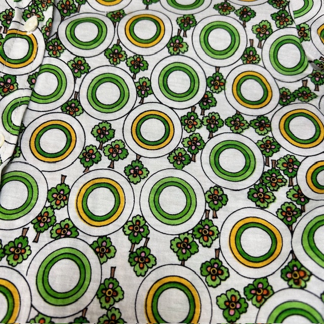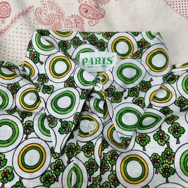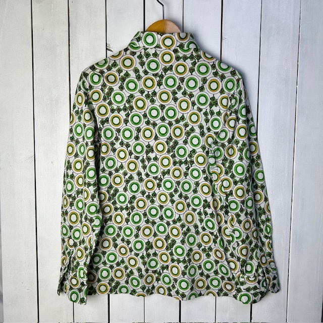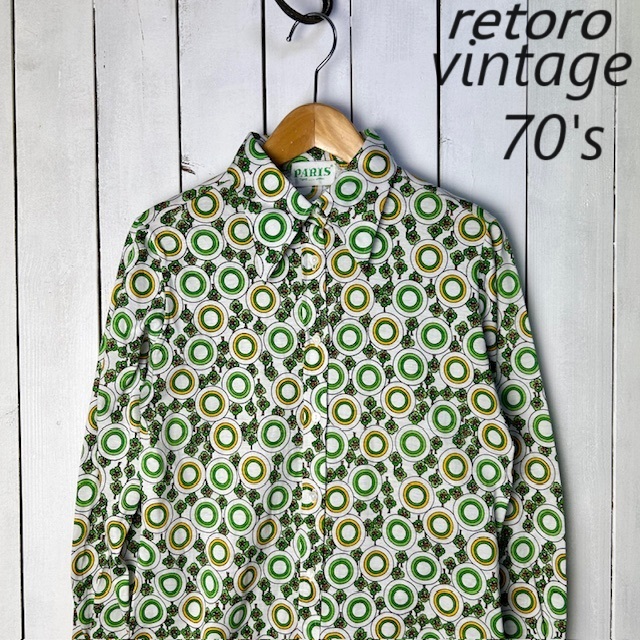 ●商品説明・・・70年代のPARIS(パリス)の昭和レトロなオールド・ヴィンテージの幾何学模様と小さな花柄を合わせたような総柄のレトロブラウス(シャツ)です。素材はコットンで、Tシャツ生地の様な質感です。色は白地にグリーン系の柄です。サイズ表記は11号ですが、70年代のタイトめな作りで、S~小さめM程度のサイズ感かと思います。