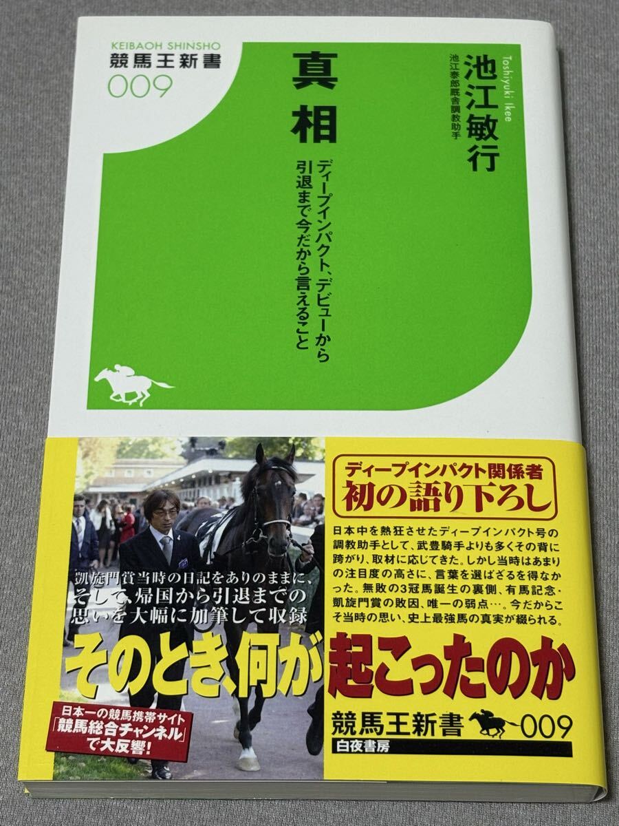 競馬王新書009 真相 ディープインパクト、デビューから引退まで今だから言えること 池江敏行著のものです。2007年白夜新書発行の初版本です。一読して保存していました。ご検討よろしくお願いします。