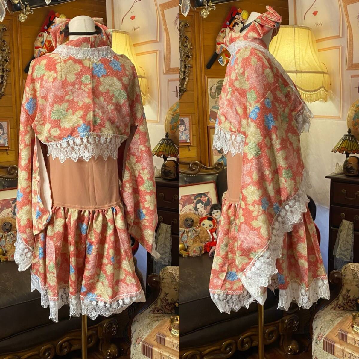 コーラルピンク地に生成り・水色・淡イエローの菊がふわりと咲くヴィンテージ羽織生地を主役に、白のケミカルレースをとろりと添えた甘美なドッキングセット。短丈ボレロはたっぷり袖と衿のレースが顔まわりを華やかに見せ、前を重ねて“着物風”にも、さらりと羽織って“ボレロ風”にも楽しめる2WAY。ワンピースは肌なじみの良いペールピンクのキャミトップに、同柄生地のギャザーフリルスカートをドッキング。やさしいコーラル×白レースに水色の差し色が映える、レトロガーリーな一点物。お茶会やお出かけ、記念日の装いにもぴったりです。