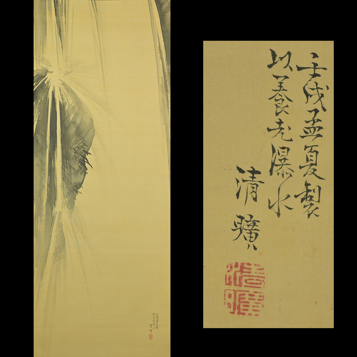 幕末・明治の四条派の画家。金沢生。名は士願、字は素竹。画を横山清暉に学び、人物・花鳥を能くする。明治10年(1877)歿、50才。 ご覧いただきありがとうございます。掛軸のコレクションを同時に出品中です。 併せてご検討ください。よろしくお願いいたします。 寸法 全長 約 203.5×74.5cm 本紙 約 133×51cm 肉筆絹本 シミ等見受けられます。 未鑑定の為、模写と表記させていただきますが、由緒のある出どころです。 その他、詳しくは画像にてご確認ください。 | ||