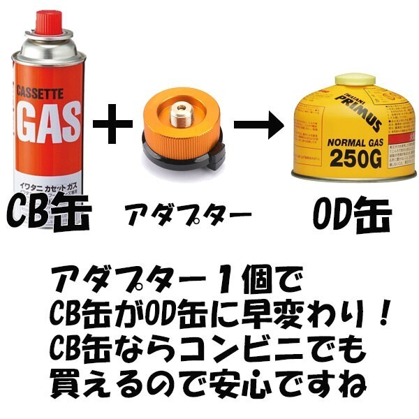 | 商品説明 | アウトドアやキャンプでおなじみの ランタン コンロなどの機材ってOD缶専用ですよね? でもOD缶って専門店でしか入手できないのが面倒だな・・・ という方には最適な商品です スーパーやコンビニで手に入る普通のカセットボンベ(CB缶)を OD缶に出来る変換アダプターです