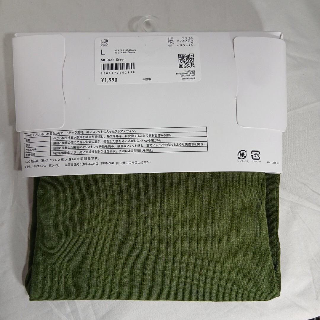 ユニクロのヒートテックのフレアスリットレギンス(10分丈)です。サイズはLで、ウエスト69~75センチ、ヒップ94~100センチです。素材は、アクリル51%、ポリエステル32%、毛13%、ポリウレタン4%です。色は、ダークグリーンです。送料が高くなるのでパッケージを外してお送り致します。未使用ですが自宅保管品です。