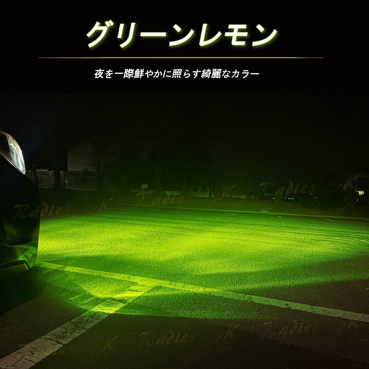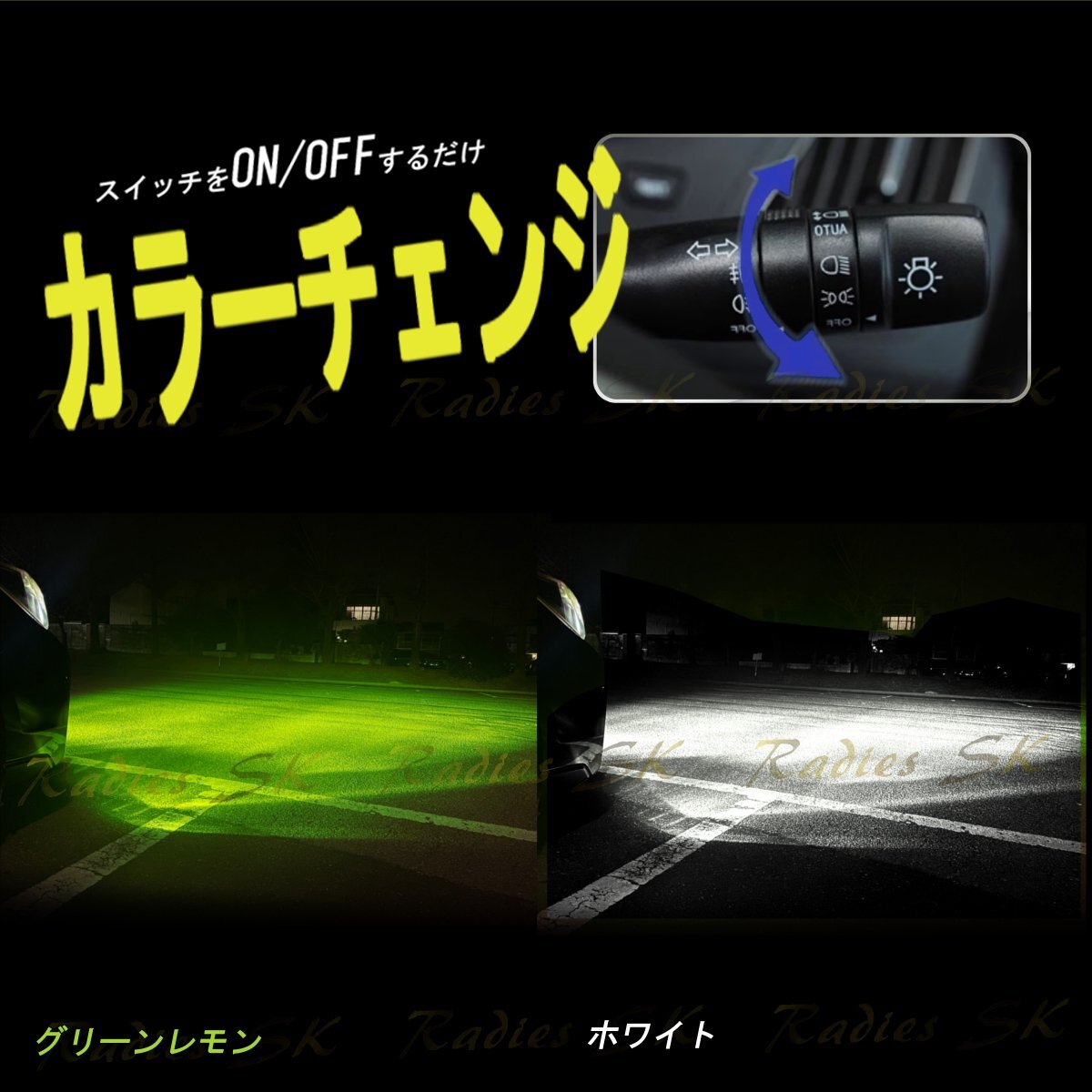 Radies SKの正規品であるこの製品は、刻印付きでその品質を保証。車内から簡単にカラーを切り替えることができるため、走行中のさまざまな状況や気分に応じて光の色を変えることが可能です。ホワイトはクリアな視界を提供し、グリーンレモンは個性的で鮮やかな光を放ちます。