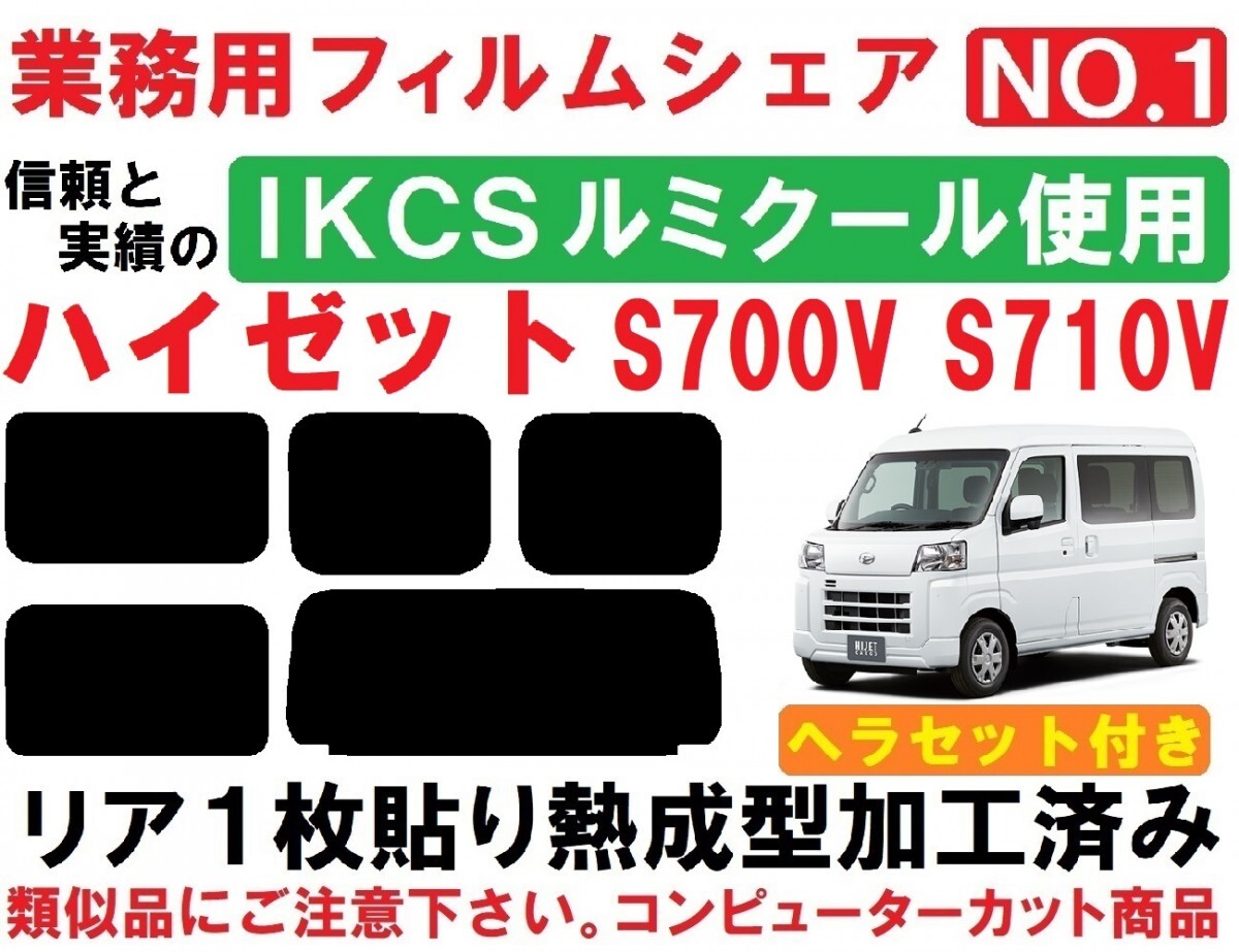 S700V S710Vハイゼットカーゴ用『IKCSルミクール使用』1枚貼り成型加工済みフィルム リア5面セットです。(専用施工液付き) ・信頼の品質と実績で永い間業務用フィルムとして選ばれ続けているIKCS製品です。 ・業務用フィルムの中で最も信頼性の高い、ベストセラー商品です。 ・詳しくはIKCS株式会社HPをご覧ください。 ※『ルミクール』は当店でも 施工実績・販売実績NO.1の超人気商品です。 令和3年12月~ S700V S710V に適合します。 ●画像3 メーカーオプション、ポップアップ機能付きガラス(スライドドア部分)にもご対応出来ます。 ●画像4 メーカーオプションのスマートインナーミラー、カメラ部分の切り抜きにもご対応出来ます。 ※どちらも、ご指定の無い場合は標準カットとなります。 ※適合等ご不明な事など御座いましたら、お気軽にご質問下さい。 ◇◆◇当商品には、画像2のヘラセットが付属します◇◆◇ ■滑りの良いシリコンタイプのゴムヘラ スムーズに水切り(清掃)・貼り付け後の水抜きが出来ます。 実際の業務でも色々な物を試しましたが、シンプルなこの形状・このメーカー・このグレードの物が1番使いやすいです。 柔軟性が有りガラス(フィルム)に密着するため、フィルム折れも防げます。 ■使いやすい厚みとコシの有るプラヘラ 形状は似ていても各メーカーにより硬さ・厚みなど色々と有ります。 慣れていない方でも扱い易いように少々柔らか目の物になります。 ヘラ先にはフッ素樹脂加工のクロスを貼って有りますので、滑りが良くキズを防止します。 ■ワイプオール(不織布ワイパー) 布同様の丈夫さと紙の持つ吸水性を発揮。糸くずの発生が無く均一素材のため異物混入の心配が有りません。 施工前のガラスクリーニング~施工時にフィルムが触れる可能性の有るガラスの周りのゴム部品の拭き取り清掃~吸水等に大変便利です。 全て実際の業務に使用している物で、その中から使いやすい物を選んでいます。 ヘラセットがご不用の場合、フィルムのみの商品も有ります。こちら ◇◆◇精密コンピューターカット◇◆◇ 貼りやすさを最優先に各部のサイズ・形状など微調整し、改良を重ねた独自のデータを製作。 高精度な最新・大型カッティングプロッターによるカットで正確で滑らかなカットラインを再現しています。 ※施工業者だからわかる、貼りやすいサイズ・形状に仕上げています。 ◇◆◇リア1枚貼り成型加工済み◇◆◇ リアガラスの湾曲に合わせて熱成型加工して有りますので、平面に貼るのと同様にたるみが出ず1枚貼り出来ます。 ※最適な状態に成型加工して有りますので、ヒートガン(ドライヤー)等は不要です。 ◇◆◇専用施工液付属◇◆◇ 軽視されがちな施工液ですが、貼りやすさに大きく関わる部分になります。中性洗剤などで代用せず、必ず付属の専用施工液をご使用下さい。 濃度については車種・季節などにより変わりますので、個別にお知らせ致します。 国内シェアNO.1の『IKCルミクール』を使用しています。 ※『IKCルミクール』は当店でも 施工実績・販売実績NO.1の超人気商品です。 IKCルミクールは経年退色が極めて少ない着色加工技術はもちろん、安定した冷暖房効率をアップする熱線遮断効果や断熱効果、内装を守り日焼けを防ぐため、全てのフィルムで99%の紫外線カットを実現しています。 ガラスの飛散防止効果で高い安全性を保ち、ハードコートタイプなのでキズにも強いカーフィルムです。 信頼の品質と性能で、永い間業務用フィルムとして選ばれ続けています。 ■フィルムの種類■ 可視光線透過率 3% NS-003HC 可視光線透過率 7% NS-008HC 可視光線透過率13% NS-015HC 可視光線透過率20% NS-020HC 可視光線透過率30% NS-030HC 可視光線透過率46% NS-045HC ■全商品、キズに強いハードコート・紫外線(UV)99%カットです。 ※可視光線透過率が低くなるほどフィルムの色は濃くなります。 サイドとリアで濃さを替えたり等、可能です。 部分的にフィルムが必要になった場合、単品販売も承ります。 他にもハイゼットカーゴ用フィルム、各種出品中です。こちらもご覧ください。 ご不明な点など有りましたら、お気軽にご質問下さい。 | ||