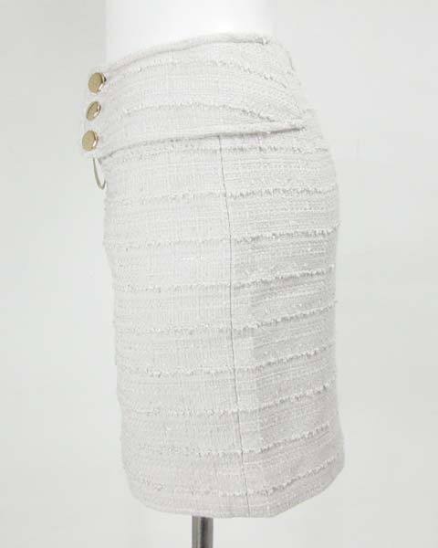 | チェーンベルト風デザインがおしゃれなミニスカート全体的にラメ糸が織り込まれていて、控えめなのに華やかです。チェーンのついた金ボタンは取り外しができますのでビジネスシーンから華やかなシーンまでお使いいただけます。スカートのお色は薄いグレージュなのでトップスやアウターともコーディネートしやすいです。 |