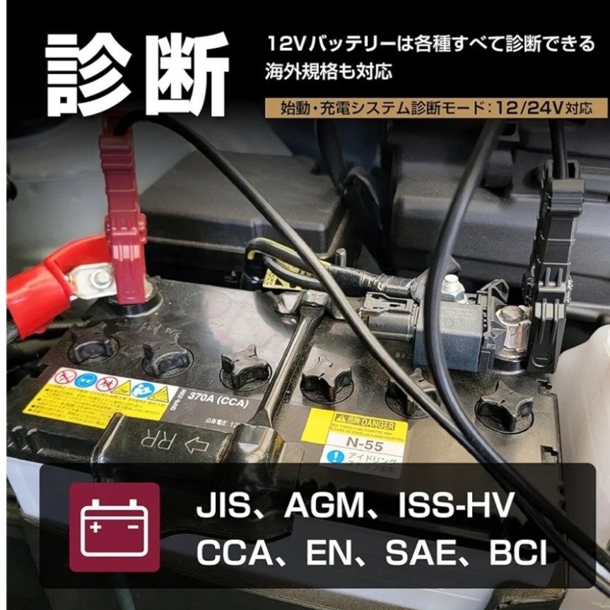 | 商品の特徴 | カーバッテリーはもちろん、バイクバッテリー・産業用バッテリーまで診断が可能なテスター&アナライザーです。(DC12V車用) 産業用バッテリーや、AGM・アイドリングストップ車用・HV補機用・通常鉛バッテリー等のカーバッテリー、MF・開放式等のバイクバッテリーまで!各主要バッテリーメーカー別プログラム搭載だから使いやすく、国内メーカーはもちろん、海外の有名輸入メーカーもカバーしています! | ||
