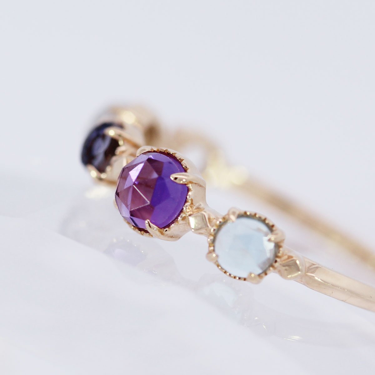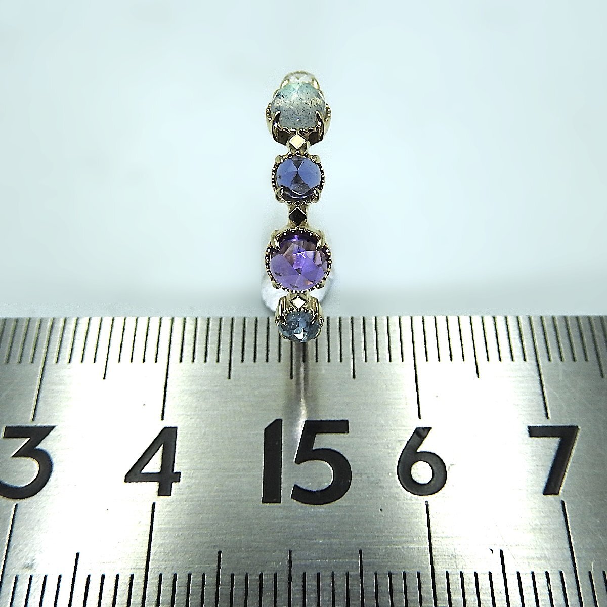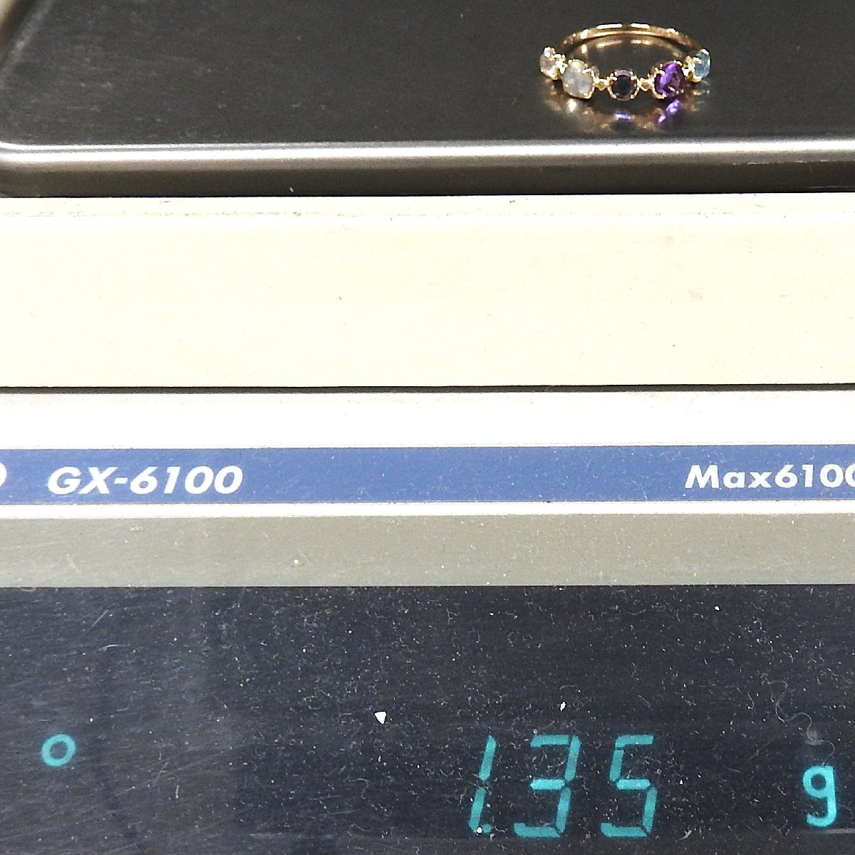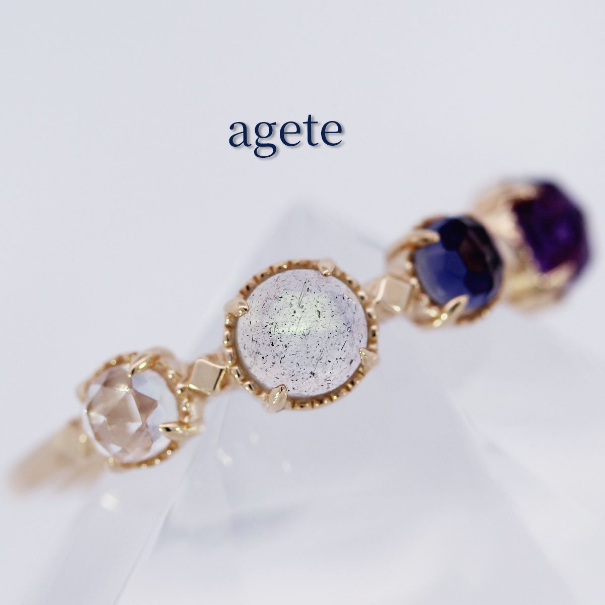 素 材 :K10PG 重 量 :約1.3g サイズ :約11号 石 名 : アイオライト/ラブラドライト/アメジスト/ホワイトラブラド 他 石目不明 説 明 :ageteの存在感のあるカラーストーンが魅力的なリングです。 1本でもボリューム感がありナチュラルカラーのネイルでも指元を華やかに演出してくれます。 アガットオリジナルでカットしたローズカットを贅沢に使用し、大小の石を交互に配置、1本で着けても重ね着けをしても動きのあるデザインにしています。 アイオライトやラブラドライトなど、アガットでも定番の石を使いながらも、アメジストやホワイトラブラドを組み合わせることでゆらめきのある輝きが集まり、幻想的な雰囲気を生み出しています。 全体的に優しい色味ですが、ローズカットがふっくらと高さのあるカットになっているので、存在感のある仕上がりになっています。 重ね着けをする時には、繊細なリングの間に挟んだり、1番下に持ってきて細身のリングをその上にいくつか重ねて存在感を楽しむコーディネートがおすすめです。 ※公式HPより引用 普段使いから、パーティーなど幅広くご使用いただけます。 貴方の指先を素敵に輝かせてくれるでしょう。 ※金性について:当社X線にて確認済みです。 ◆セール期間等についてはインスタで先行配信しております。◆ 【金のみせ】で検索していただくと「lojadeouro-金の店-」が当方になります。 ※クリーニングはしておりますが、中古品につき多少の傷汚れございます。ご了承くださいませ。 |