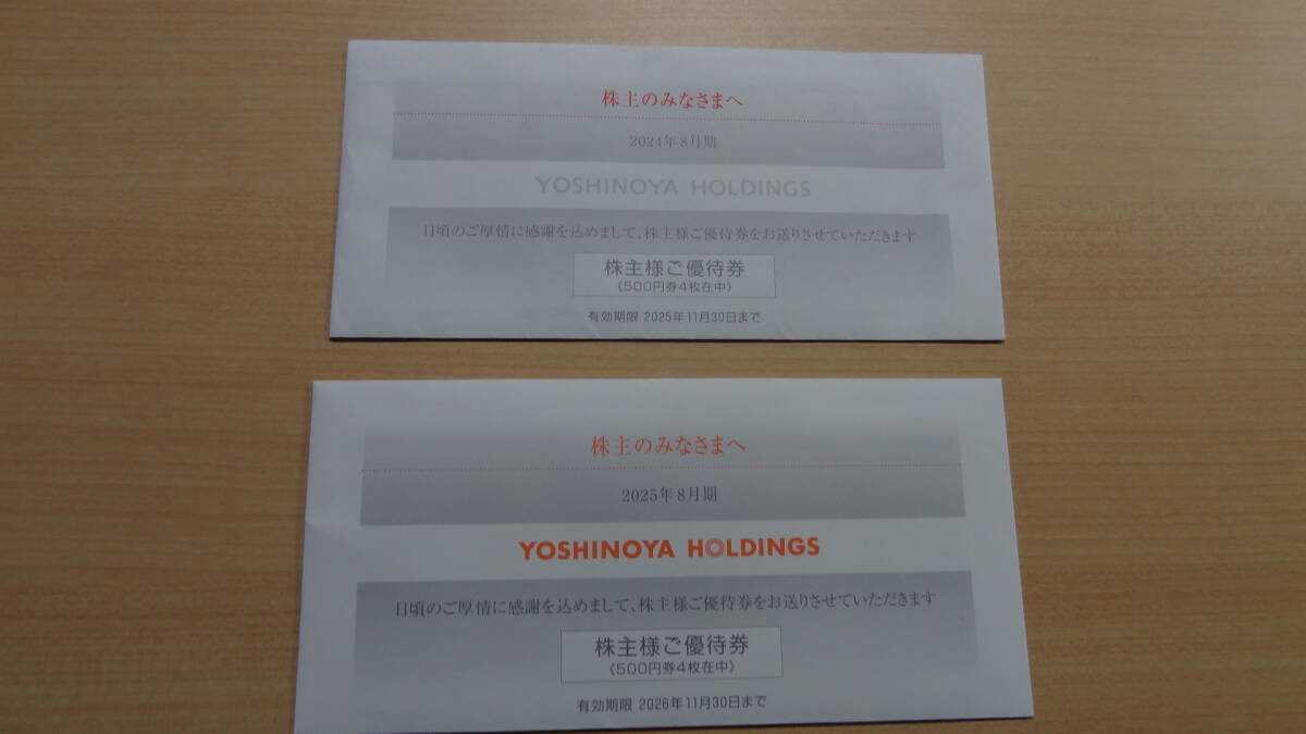 吉野家株主優待割引券 500円X8枚になります。有効期限が4枚は26年11月30日までで、後4枚は25年11月30日になってます。| 出价者 | 信用 | 价格 | 时间 |