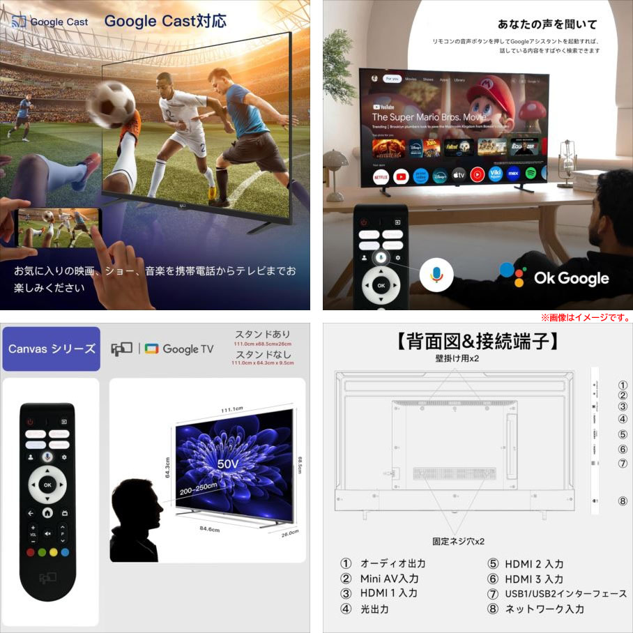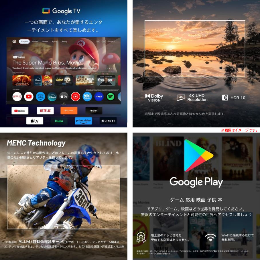 【商品特長】 ◆Google OSを搭載 Google テレビ は包括的なエンターテイメント エクスペリエンスを提供し、ユーザーはさまざまなストリーミング サービス、 アプリ、ライブ TV チャンネルに1か所でアクセスできます。 直感的なインターフェイスと音声コントロール機能により、 お気に入りのコンテンツを簡単にナビゲートして見つけることができます。 ◆スマートテレビ チューナーレス NETFLIX、Prime Video、YouTubeなどのプリインストールアプリに加え、Google Play ではアプリ、ゲーム、映画、 音楽などをダウンロードでき、さまざまなコンテンツに簡単にアクセスして楽しむことができます。 本機は、テレビ放送チューナー(地上波/BS/CS)を搭載していませんので、地上波・BS/CSをご覧になる時は 別途外付けのチューナーが必要です。 ◆精細で臨場感のある画質 4K Ultra HDは、鮮明で細部まで美しい映像を提供します。 Dolby Visionは、高ダイナミックレンジ(HDR 10)技術を使用して、色彩豊かで臨場感あふれる映像を実現します。 これらの機能を組み合わせることで、最高品質の映像体験を楽しむことができます。 | |||||||||||||||||||||||||||||||||||