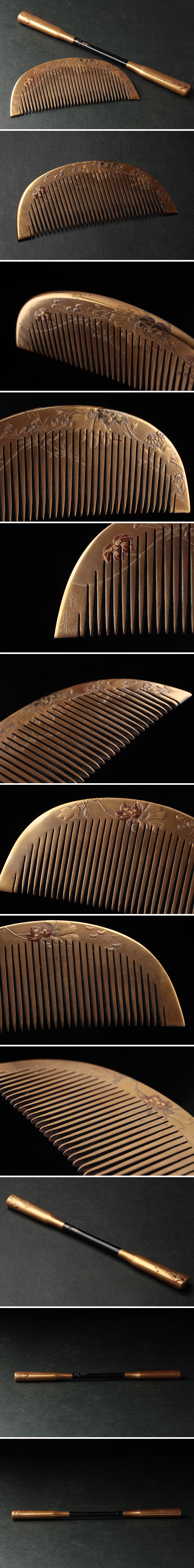 | ◆ 時代装身具【松華 銘】金地草花蒔絵櫛・笄「鼈甲地金粉溜地蒔絵櫛」挿櫛笄揃 明治時代 装飾具 髪飾り 古美術 ◆