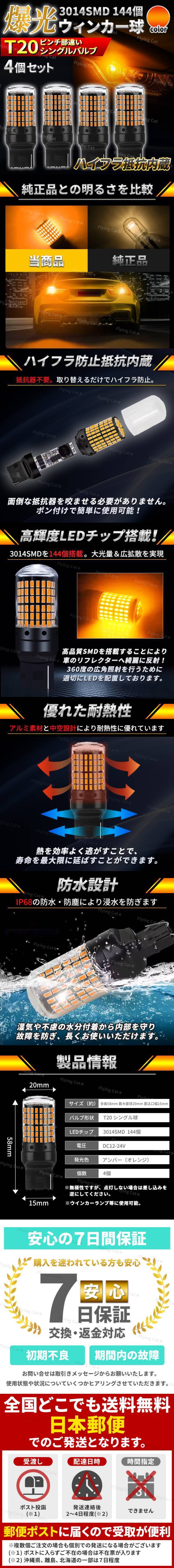 4個セット ■多機能&高性能のLEDライト 12Vから24Vの車両に対応し、多様な車種に対応可能です。 鮮やかなアンバーカラーでドレスアップ、カスタムにも。 キャンセラー内蔵になります。 ※すべての車種でキャンセラー解消というわけではありませんのでご了承ください ■爆光 高輝度&拡散照射仕様 高輝度の3014SMD LED144連搭載で、極光を実現。 超拡散レンズ(フルカバー)付きで全方位を明るく照らします。 省エネで純正ハロゲン球よりも明るく、およそ3倍の明るさ。 ■簡単取付け&多用途利用 全幅がS25純正球と同じサイズなので、ウインカー、コーナーランプ、リアフォグランプ、ターンシグナルランプ、テールランプ等にご使用いただけます。 無極性ですのでそのまま差し込むだけで簡単に交換可能です。 ■高い耐久性&放熱効果 アルミ素材と中空設計により、優れた放熱効果と耐久性を実現。 熱を効率よく逃がすことで、寿命を最大限に延ばすことができます。 ■様々なメーカーに取付け可能 トヨタ/レクサス/ホンダ/ニッサン/スバル/三菱/ダイハツ/スズキ など、軽自動車、普通自動車問わず、各自動車メーカーに適合します。 ※車種により適合を確実に保証するものではございません。 |