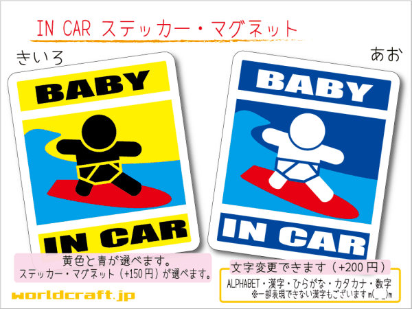 クルマのうしろにペタリとどうぞ!! ●サイズ : 縦 10.5cm × 横 9cm ●枚数 : 1枚 ■ 仕様選択 : ■ カラー選択 : 黄色 / 青 ☆仕様とカラー、それぞれどちらかひとつ お選びください☆ 画像1にはマグネット仕様+150円と書かれていますが、 このたびステッカーと同じ価格になりました☆ 現在マグネット仕様に追加料金はございません 落札後、取引ナビにて ご希望の仕様(ステッカー / マグネット)、ご希望カラー(黄色 / 青) をお知らせくださいませ ★ 耐久性UPしました ★ 耐水・耐候 屋外用塩ビシート仕様 ☆当店だけでしか買えないオリジナルデザイン☆ Made in JAPAN □ □ □ □ □ □ □ □ □ □ □ □ □ □ □ □ □ □ □ BABY IN CAR、BABY on BOARD、CHILD IN CAR、CHILD on BOARDバージョン、その他スノボバージョン、スケボーバージョン、野球バージョンなどなどいろんなバージョンいっぱい取りそろえております☆ ☆その他 出品中の○○ IN CAR ステッカーシリーズ☆ ・BABY IN CARステッカー ・CHILD IN CARステッカー ・○○ IN CARステッカー(大人バージョン) ☆もうひとつのオークションID i306st でも BABY CHILDステッカー出品中☆ BABY ・ CHILD ☆どうぞよろしくお願いいたします☆ ※お休みの連絡などある場合がございますので、ご入札前に必ず自己紹介欄をご覧くださいませ※