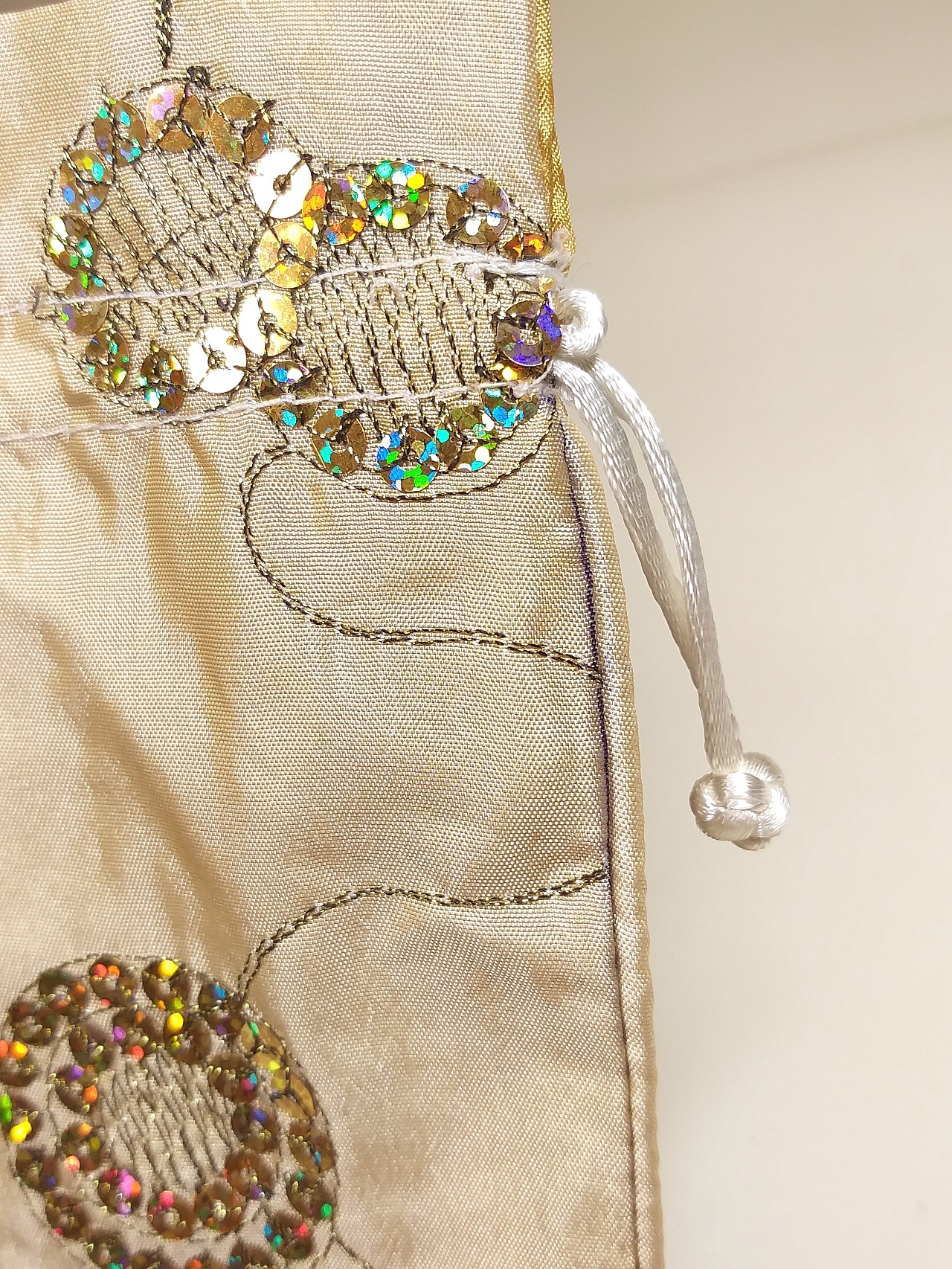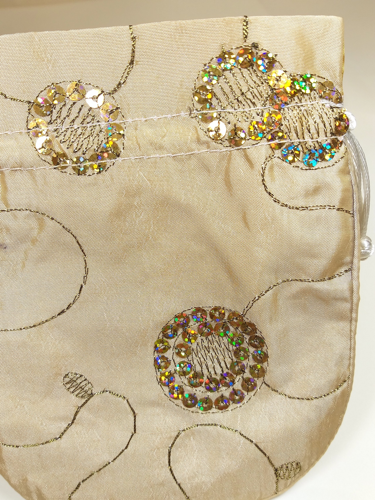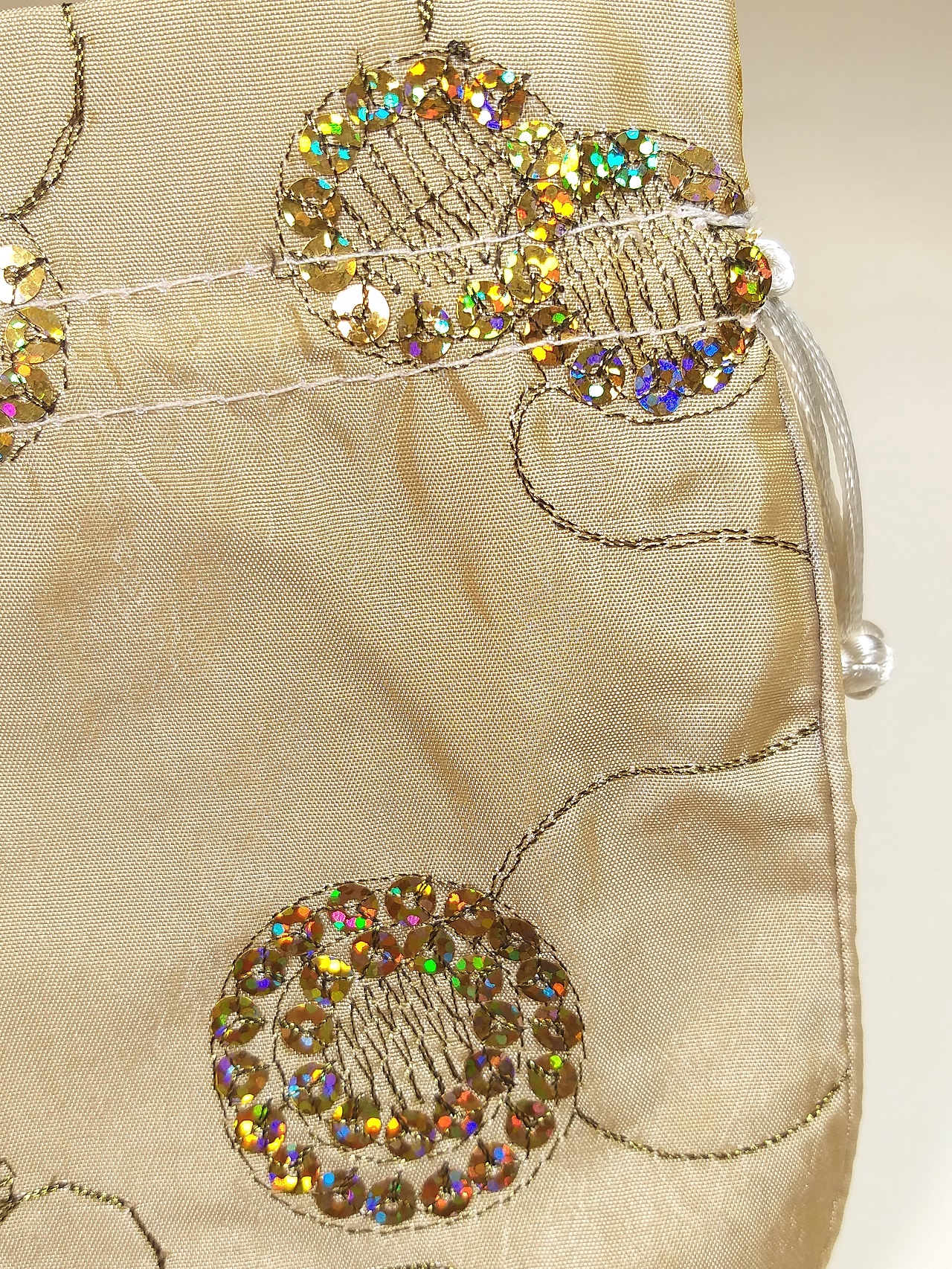 2.12枚目の写真をご覧ください。巾着は、正、裏面は金線刺繍に加え七彩虹色スパンコールで花模様が縫い付けられています(10種類の中の数種類は、片面加工の品になります)。