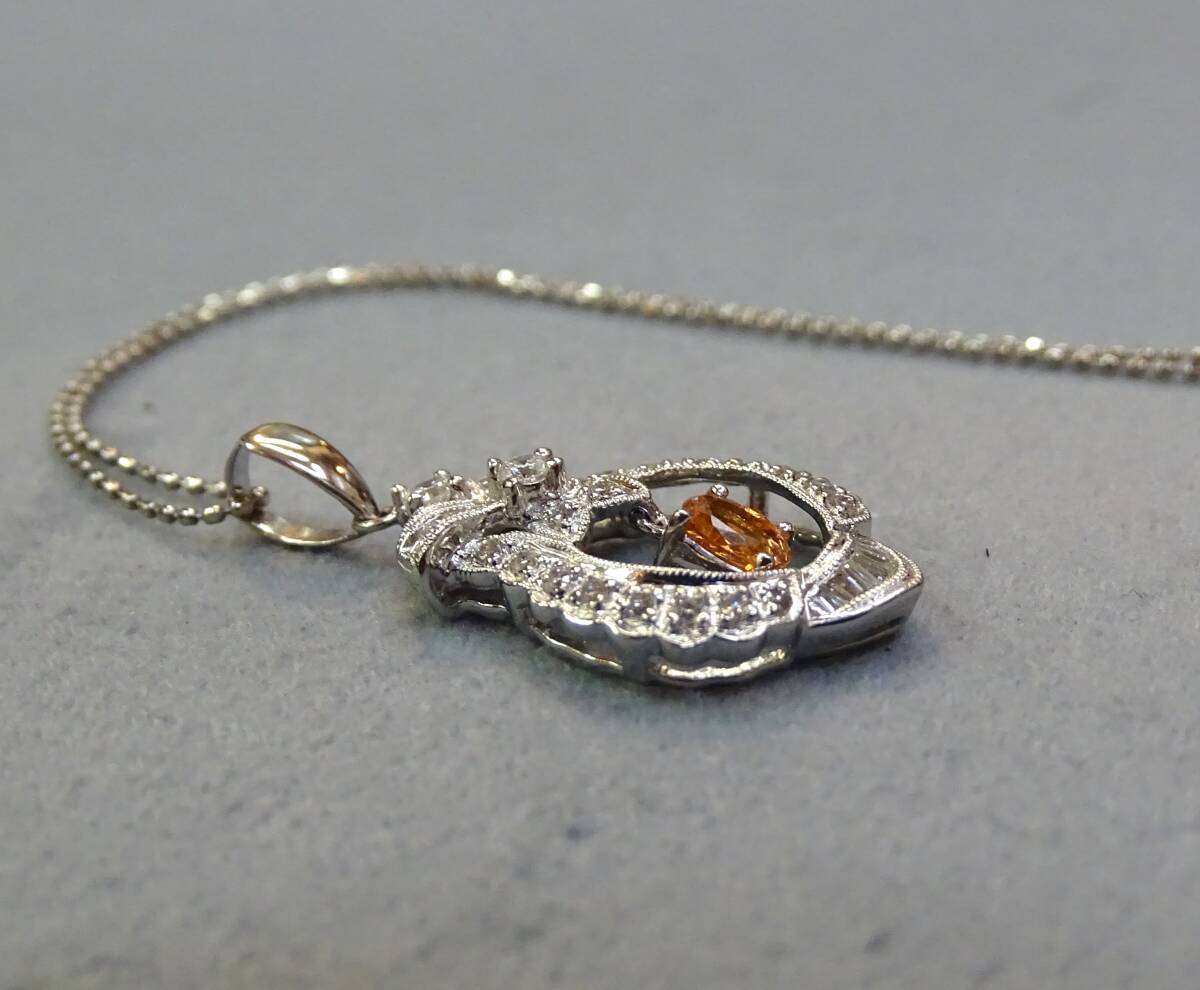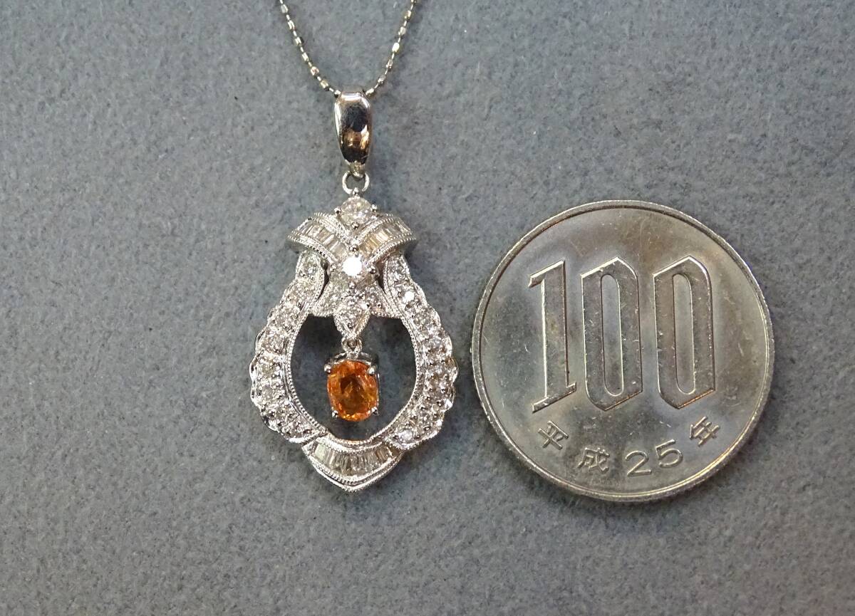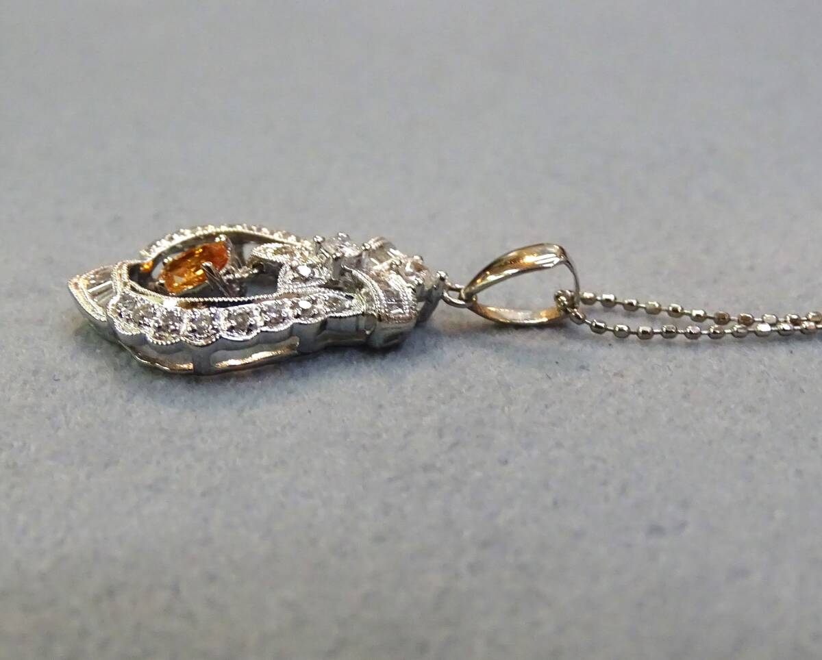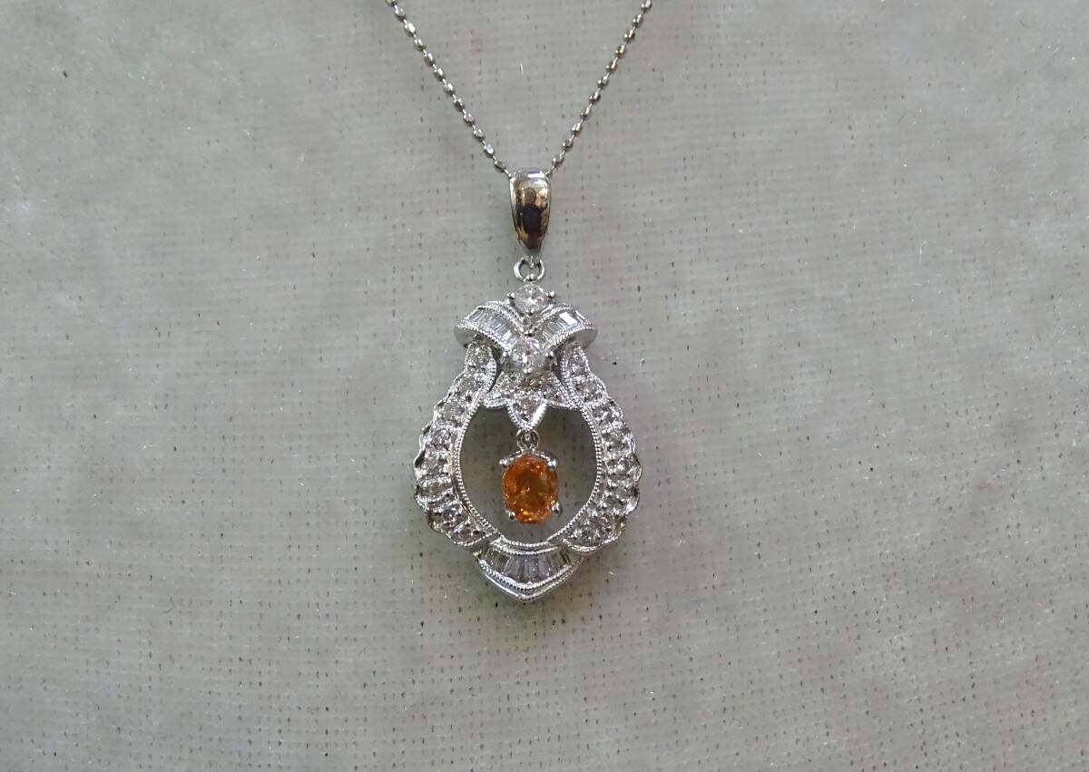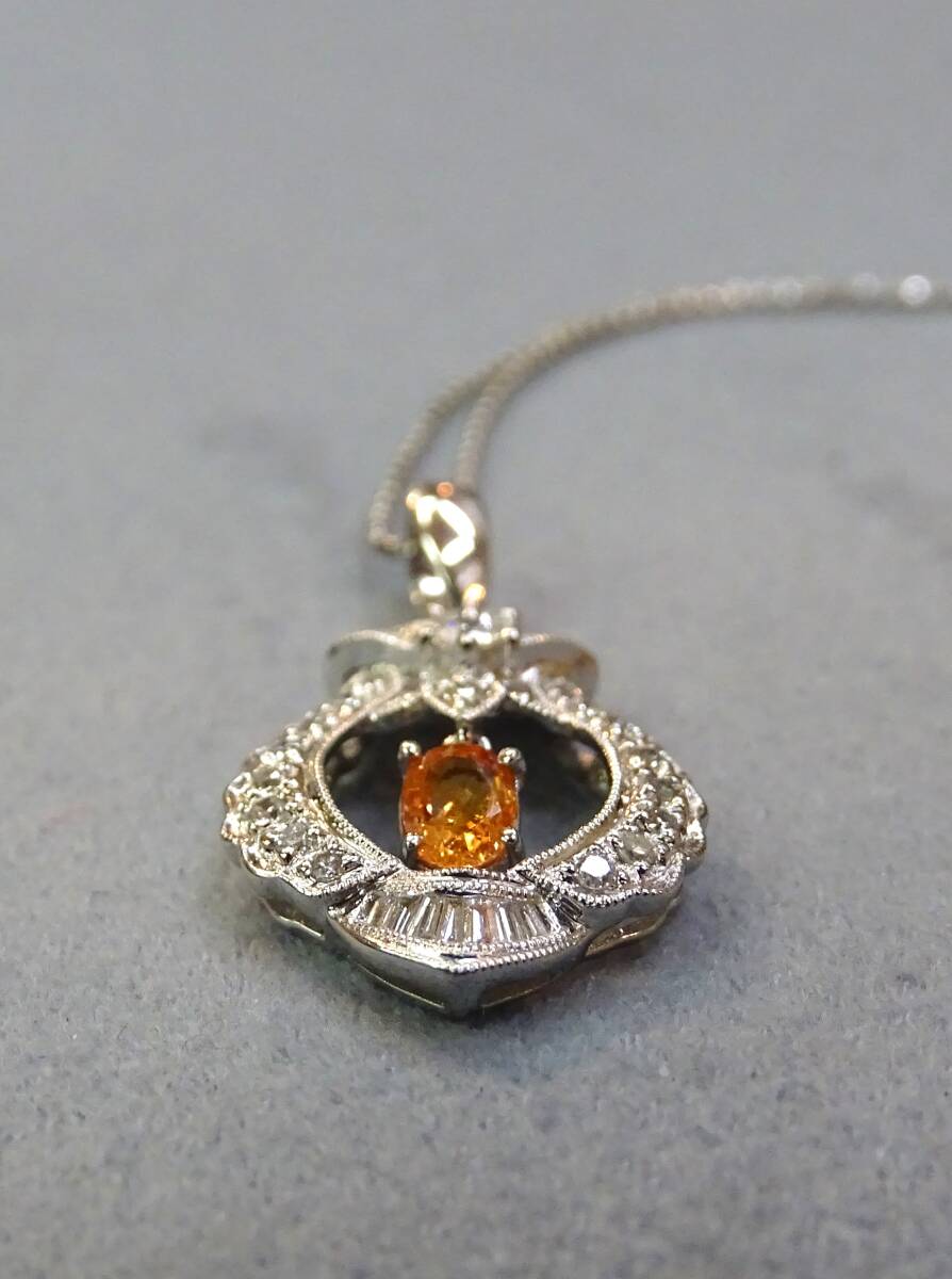 ♪輝き・テリの良い!綺麗なオレンジ・カラー!レア・希少・貴重な上質【天然:オレンジ・サファイヤ】【0.38c】を【K14WG】【天然ダイヤモンド:0.38c】製のペンダント枠の中央に揺れる様に留められています!レア・希少・貴重なペンダントを、ご自分へのご褒美に、またプレゼントにも、この機会にどうぞ!