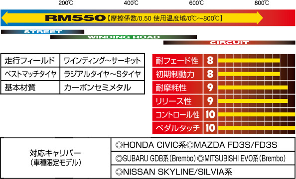 | ■商品説明 | オールラウンドパッドでありながら、サーキット走行を重視するユーザーに最適のモデル。高温時の安定性はそのままに、よりコントロール性を追求したまさに「走り屋支援パッド」です。 低温時から初期制動を与えストリート性も考慮、中高温時よりロック率を下げることにより低温から高温まで幅広く使用可能でありコントロール性を重視したモデルであり踏力に応じて制動力が立ち上がるタイプに仕上がっています。 |