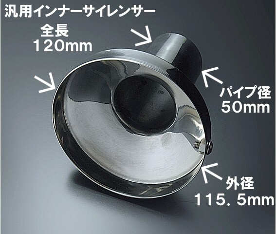 | 商品内容 | マフラーのテールに差し込むタイプの汎用インナーサイレンサー。 ボルト1本で固定する簡単脱着タイプ。 (レンチは付属しておりません) |