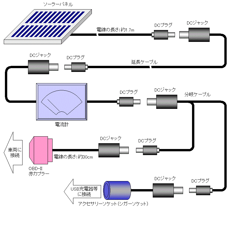 太陽電池パネルの発電エネルギーをOBDコネクタ経由で車のバッテリに充電。