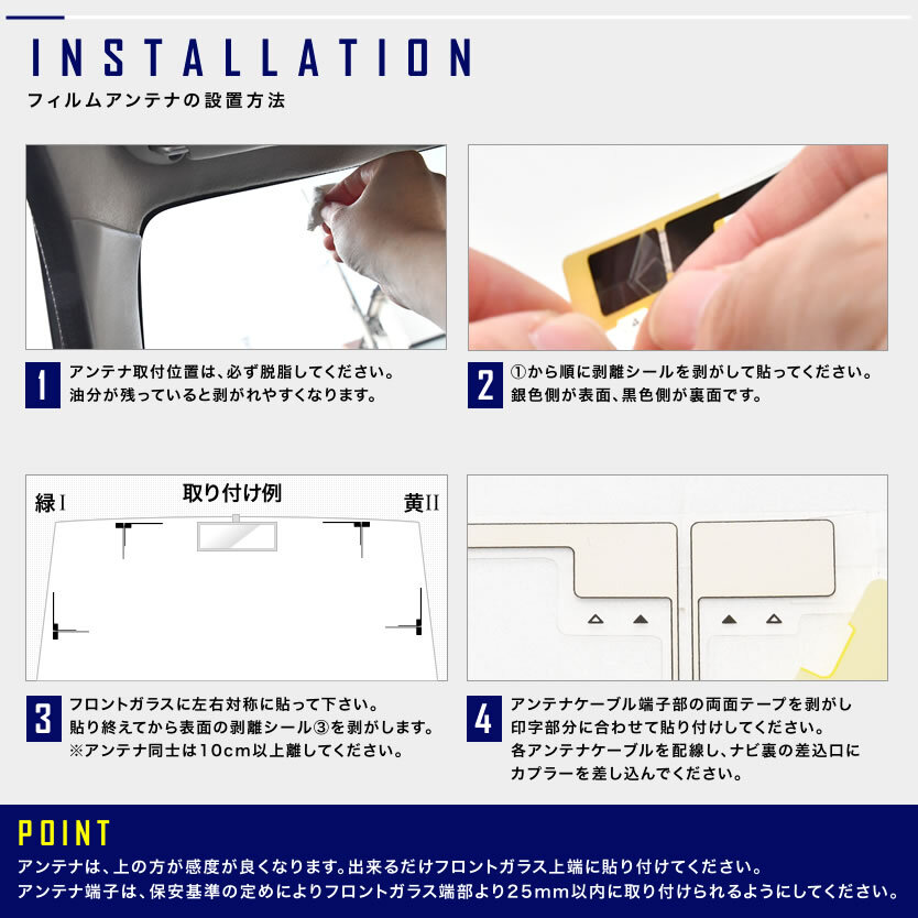 | 内容 | フィルムアンテナL型(緑I×2、黄II×2)、アンテナケーブル(各5m)×4、ケーブルクリップ×8 |