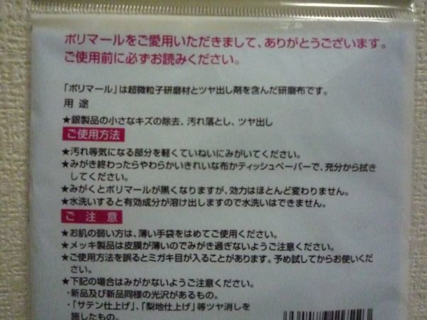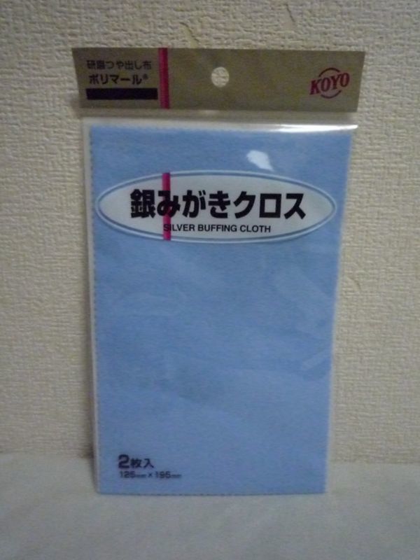 ●その他:研磨つや出し布。 これ一枚で拭くだけ簡単、手間いらず。 超微粒子の研磨材とツヤ出しワックスが含まれた独自の研磨ツヤ出し布です。 各素材の小さなキズ、汚れを簡単に落とし光沢をよみがえらせることができます。 銀製品の小さなキズの除去、汚れ落とし、つやだしに使用できる。