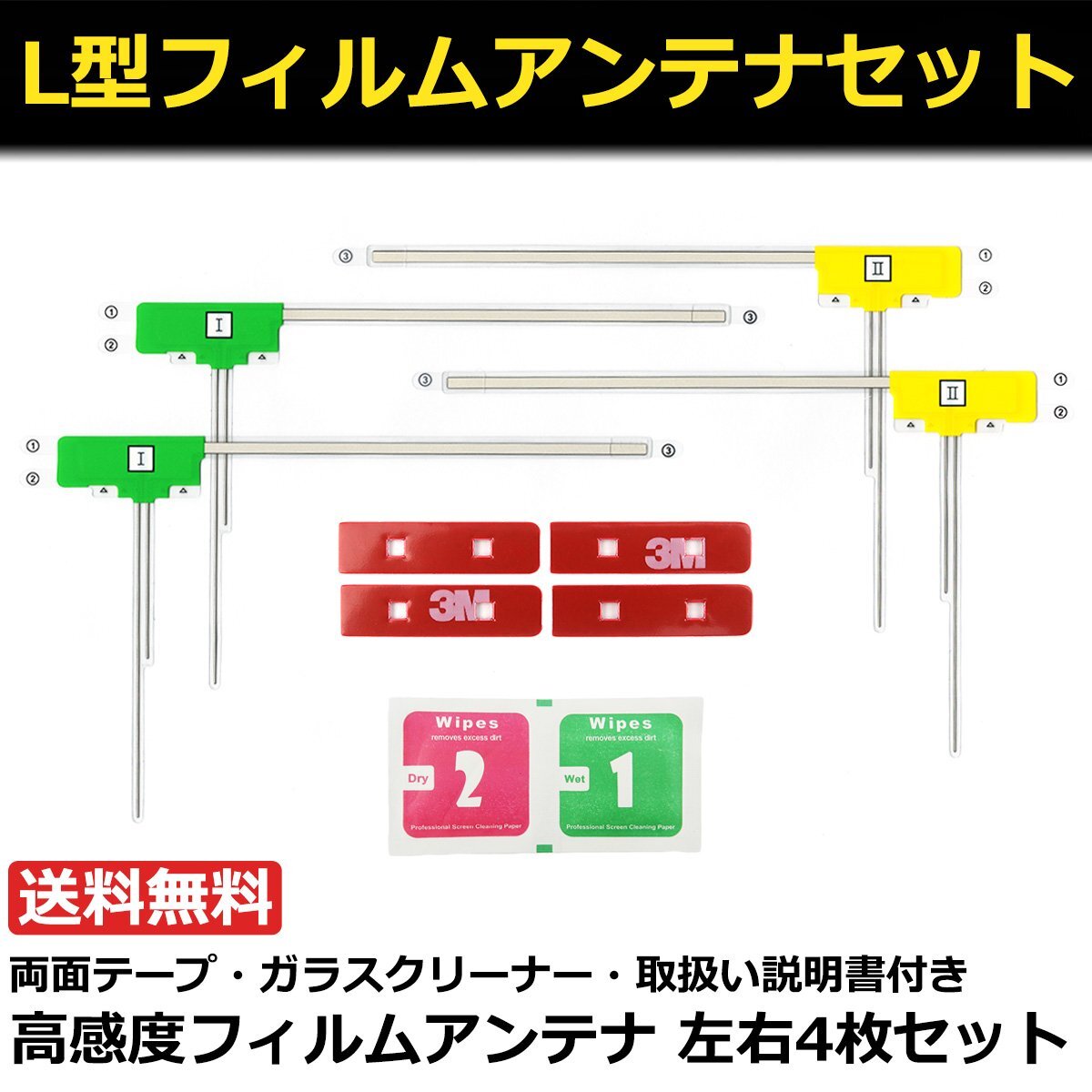 セット内容 | ■フィルムアンテナ左用x2枚、フィルムアンテナ右用x2枚 ■地デジアンテナコード端子用両面テープx4枚 ■ガラスクリーナーx2枚 ■取り付け説明書x1枚 |
