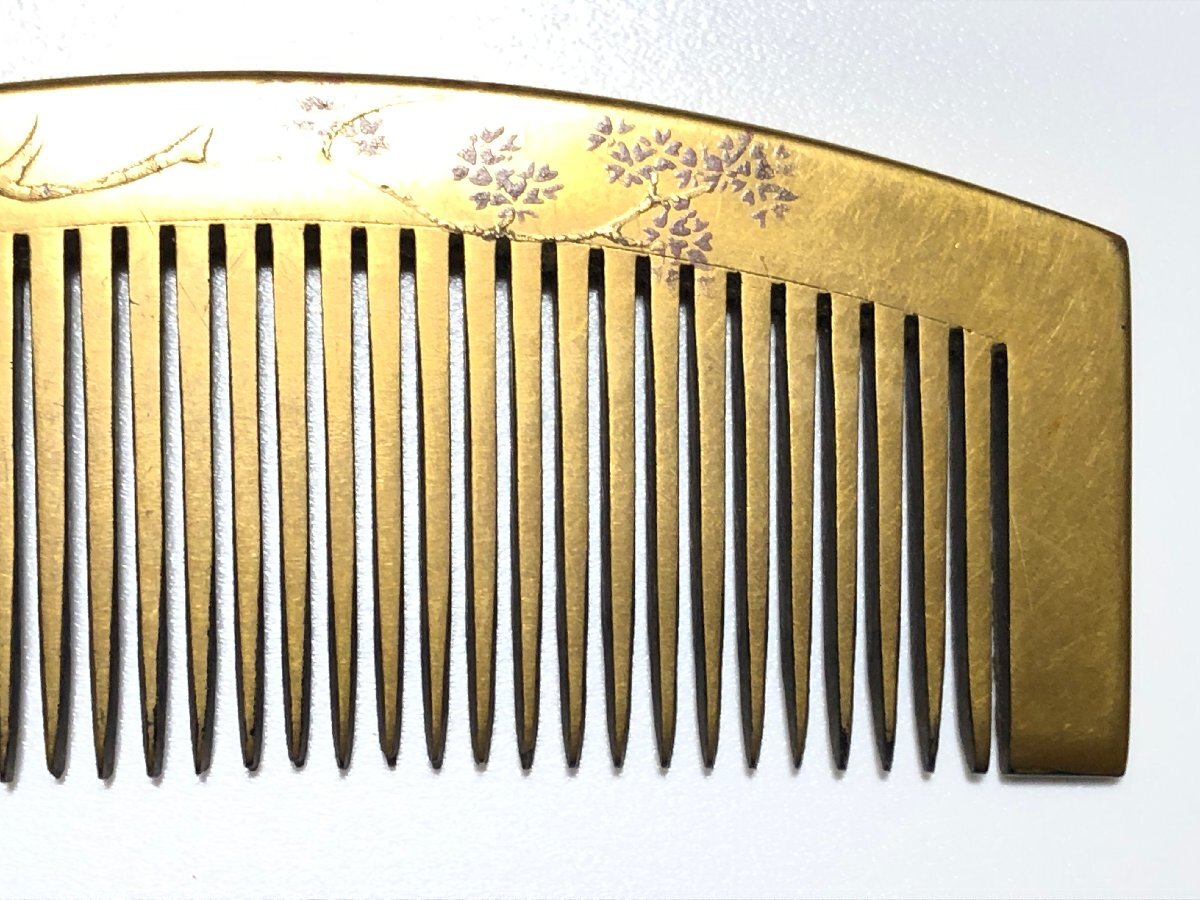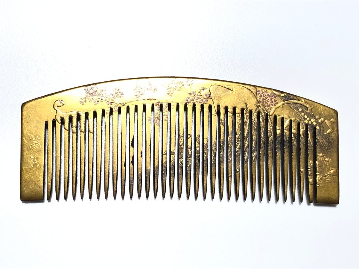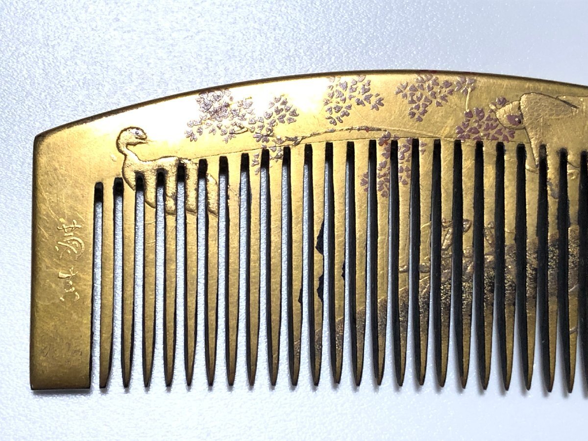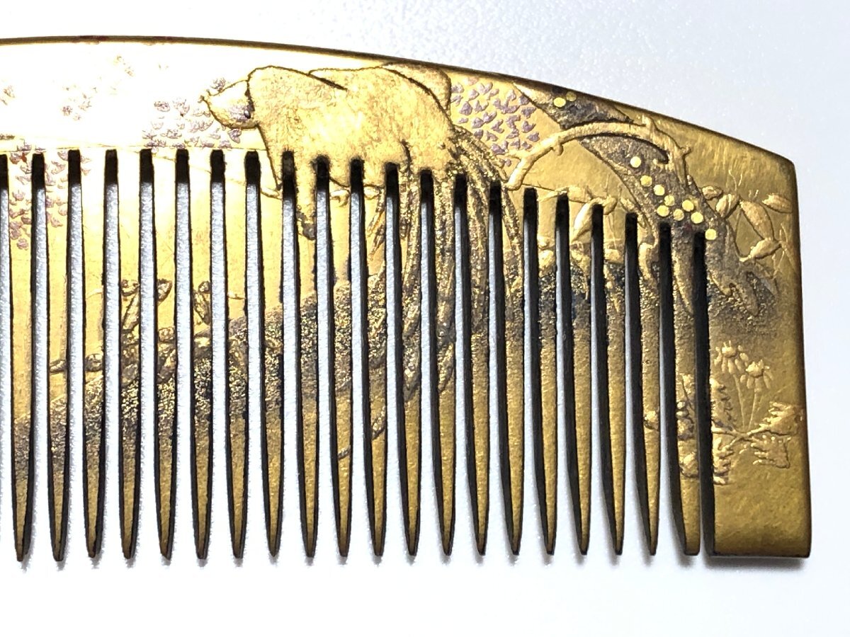 アンティークの本鼈甲を使用し、金蒔絵を施した、秋山景に尾長文の櫛です。作者の銘があります。歯間部分に小さな虫食いが3ヵ所あります。| 出价者 | 信用 | 价格 | 时间 |