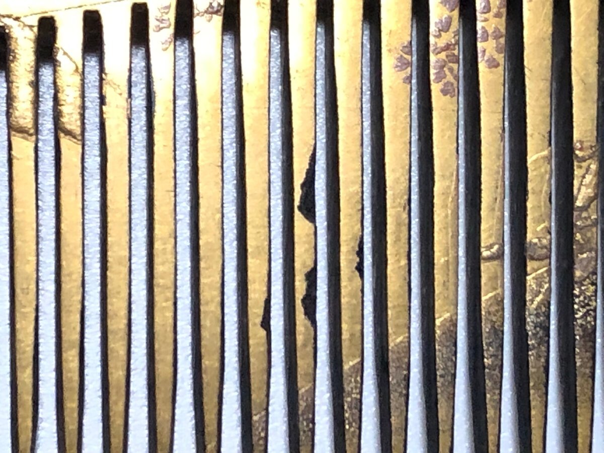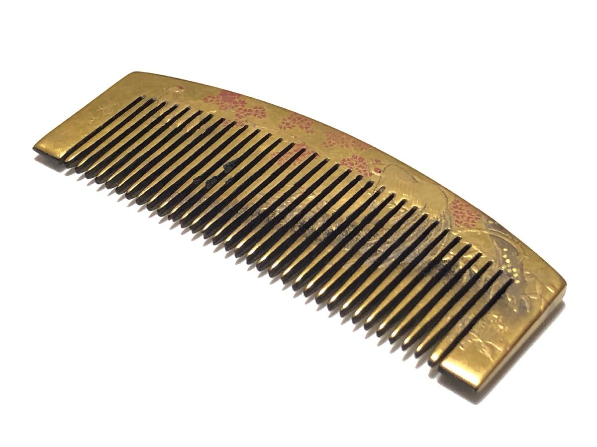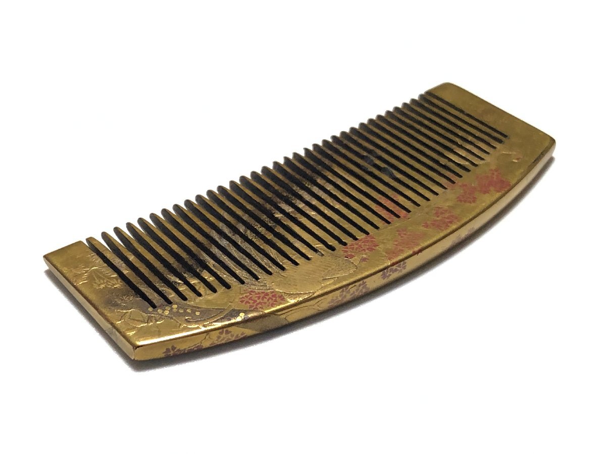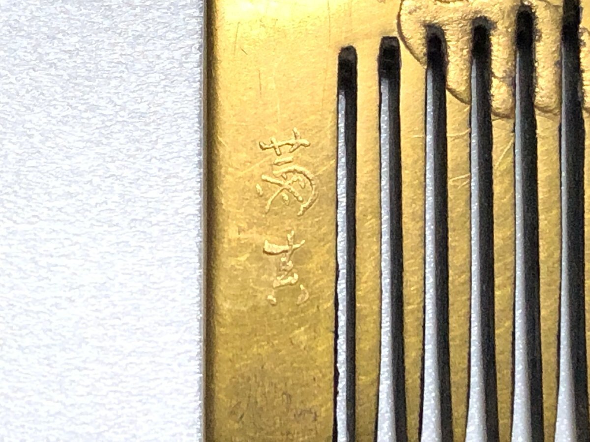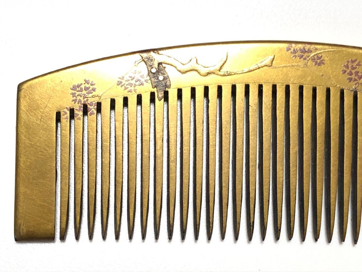 アンティークの本鼈甲を使用し、金蒔絵を施した、秋山景に尾長文の櫛です。作者の銘があります。歯間部分に小さな虫食いが3ヵ所あります。| 出价者 | 信用 | 价格 | 时间 |