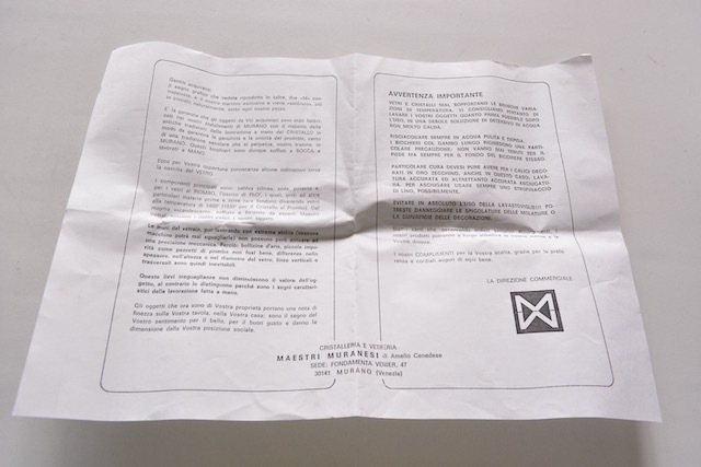 [発送方法/送料は下の方に記載しております。] イタリア ヴェネチアのムラーノの工房による作品です。 ゴージャスなデザインは、クリスマスやお正月のお祝いの場にもぴったりです。 サイズ: 口径7×7.5cm位 高さ13cm (サイズについて) 実寸は平置きにて測りました。若干の誤差はご了承下さい。 カラー: (画像の色ついて) PC・モバイル環境によって、また個々の色に関する認識にも個人差があります。 色表現は言葉でも写真撮影でもとても難しく、実際のお色と全く同じようには表現するには限界がありますことをご了承下さい。 状 態: 使用頻度はほとんどないと思われますが、経年保管によりグラスにくすみがあります。 洗浄せずにこのまま出品しております。 キズ、チップ、ひびなどのダメージはありません。 外箱にはマジックの文字書きがあります。 * 気づいた点があれば記載させていただいておりますが、中古状態(ダメージ、匂い等々)に対する判断は個々に違います。USEDをご理解の上でご検討ください。 |